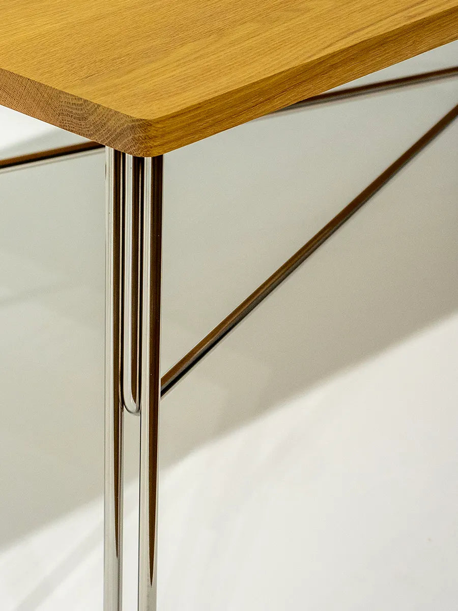 Stellet er lavet af poleret rustfrit stål og bordpladen er lavet af massiv eg.