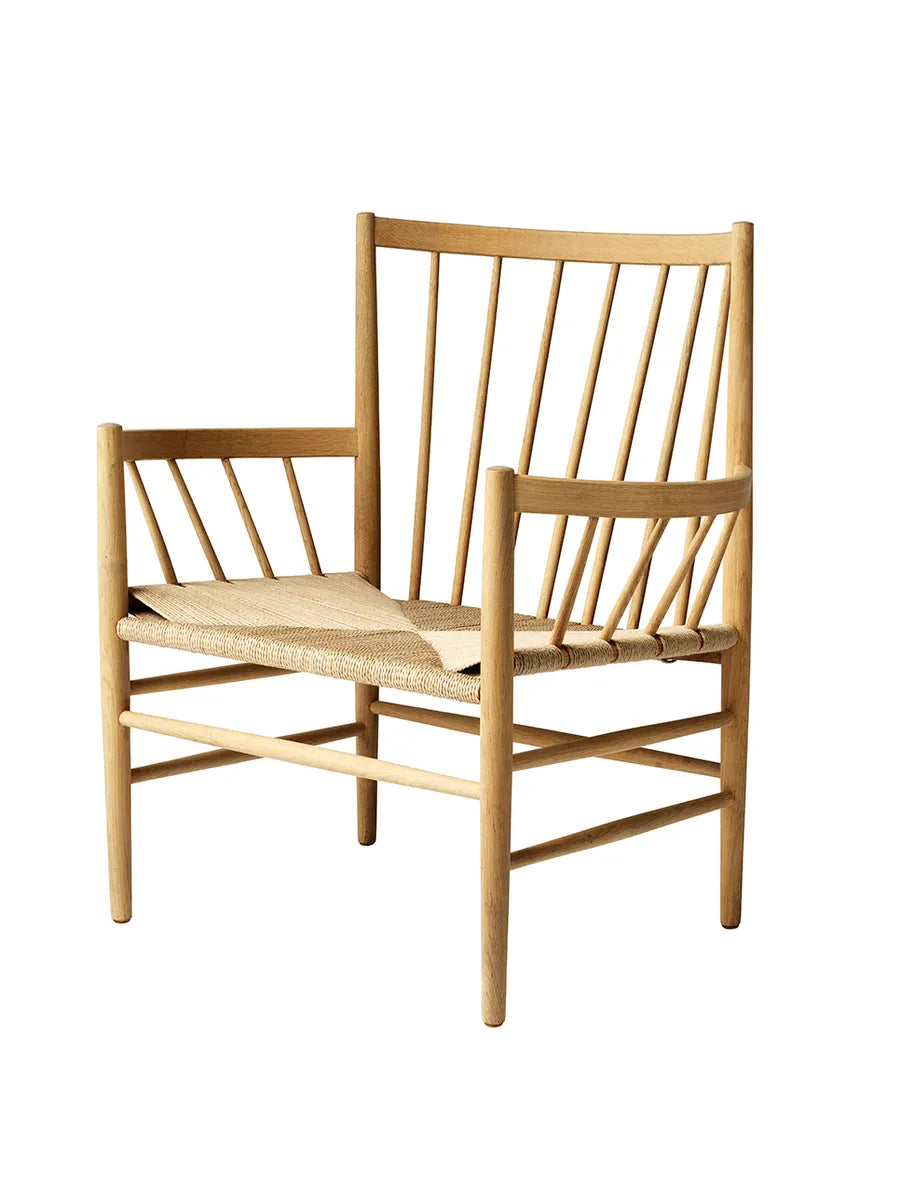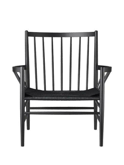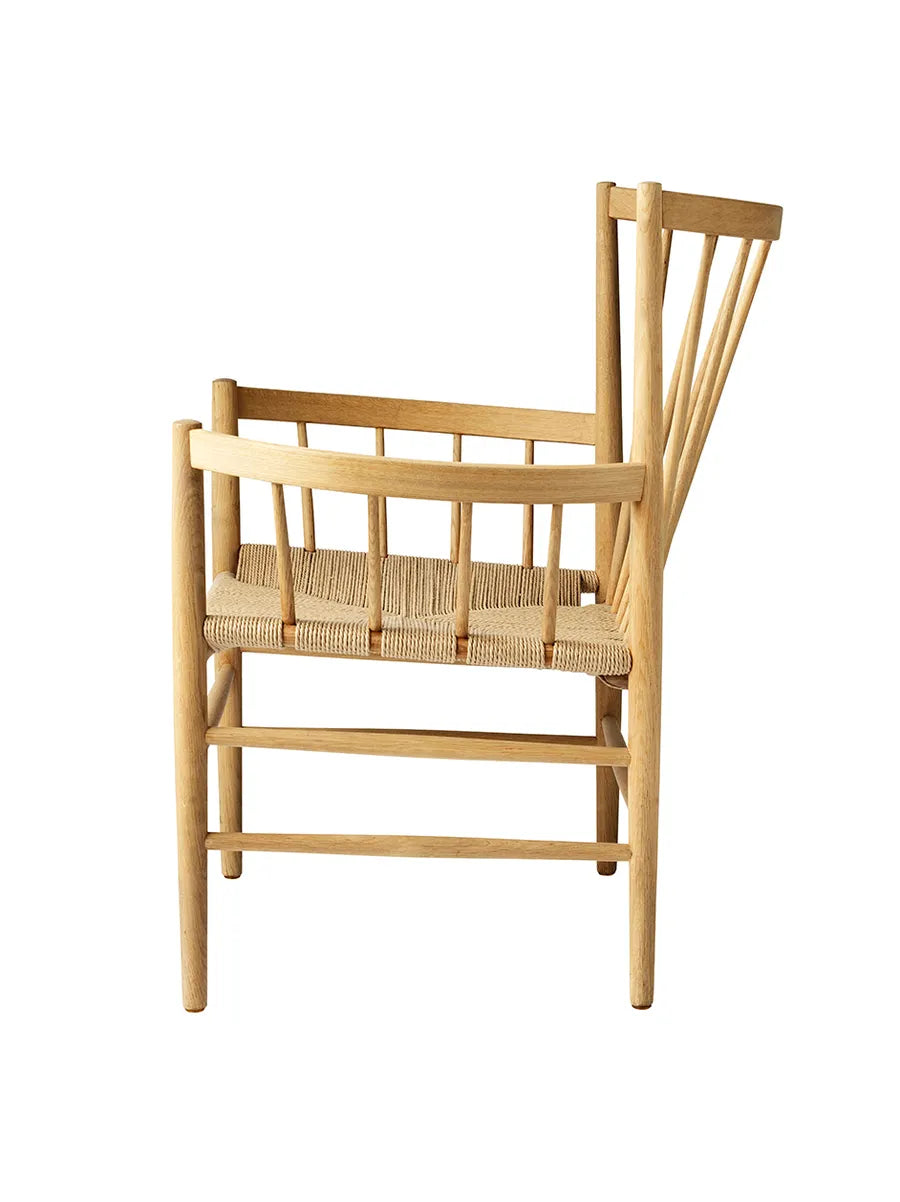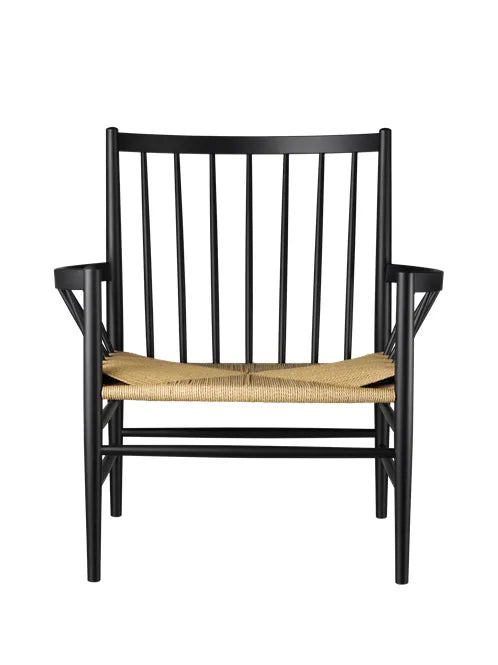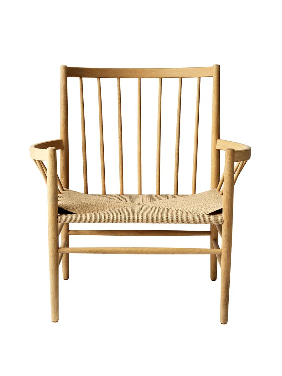 Loungestolen J82 er lavet i massiv eg eller bøg med håndflettet sæde i natur eller sort.
