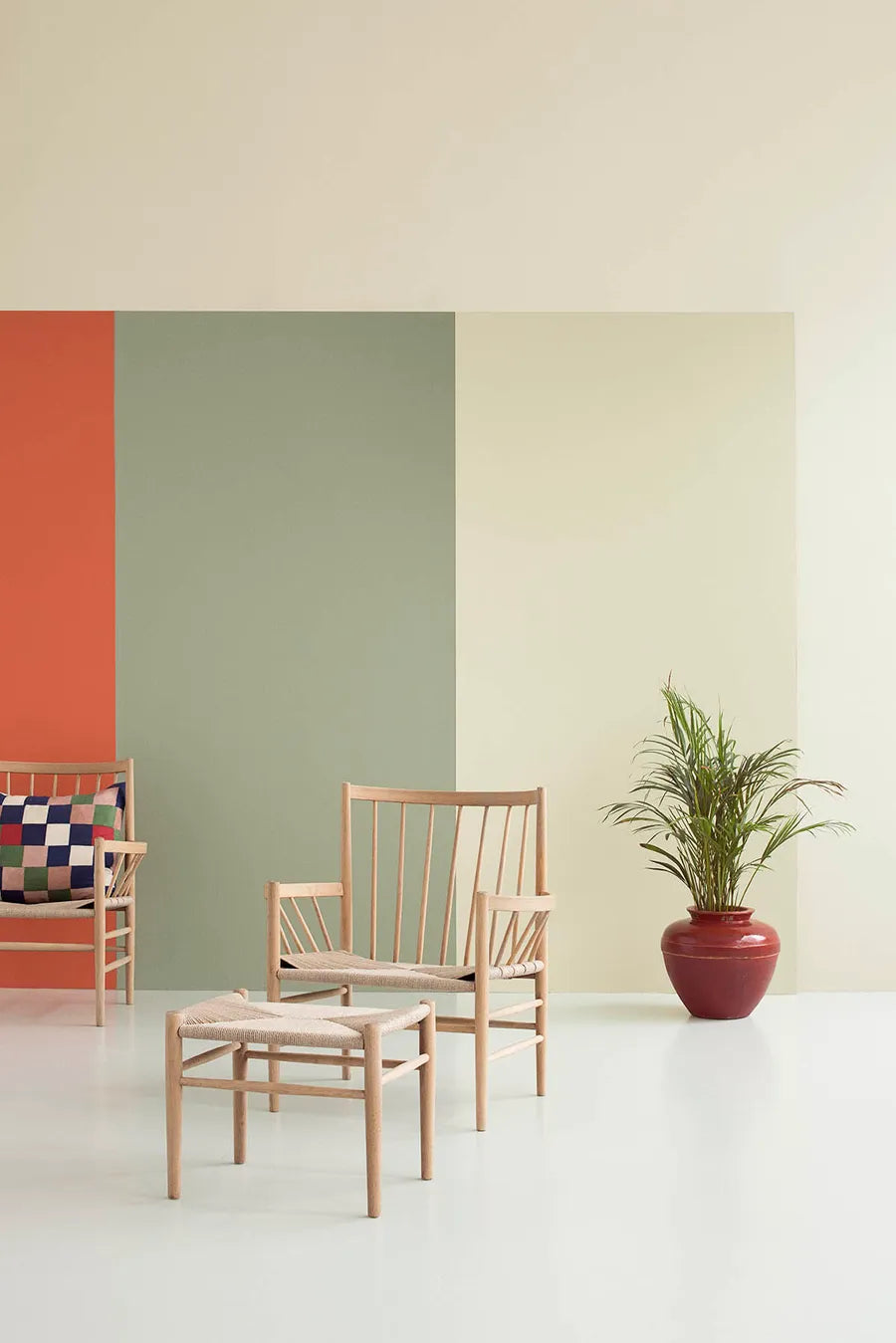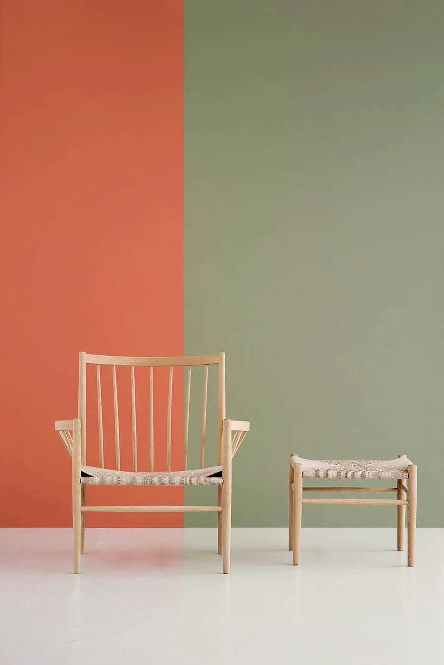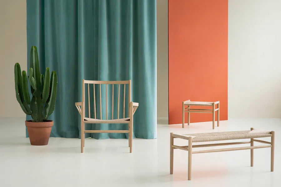 Loungestolen J82 er lavet i massiv eg eller bøg med håndflettet sæde i natur eller sort.