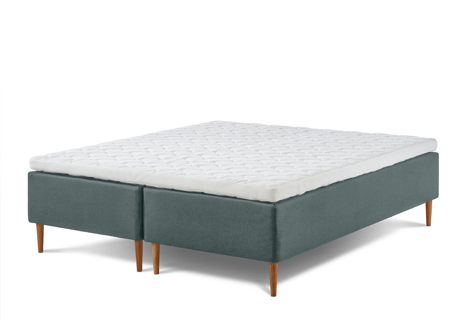 En gennemført boxmadras med lækre detaljer og udsøgt komfort polstret med skum og et unikt fjedersystem. Sengen består af følgende: - 2 x Boxseng 90*200/210 cm - 1 x Topmadras (180-200/210 cm) - Ben: Eg/olie (Cone) - 2 x Boxklemmer i plast Farve: - Blå Hårdhed: Medium eller fast.