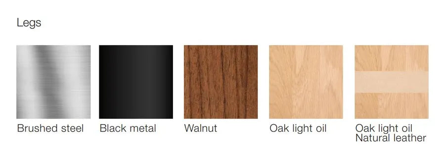 Materiale: læder eller tekstil. Ben i træ eller stål.