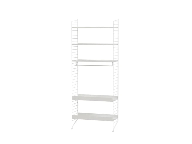 Kitchen Bundle G fra String Furniture er en gulvmonteret køkkenreol, der giver dig masser af opbevaring på minimal plads. Den smalle opstilling er ideel til det mellemstore køkken, hvor du vil frigøre bordpladen og samtidig have alt lige ved hånden. Med fem metalhylder får du en praktisk og overskuelig zone til service, glas, krydderier og de ting, du bruger hver dag, og den integrerede stang gør det nemt at hænge redskaber eller viskestykker op, så køkkenet føles mere ryddeligt.