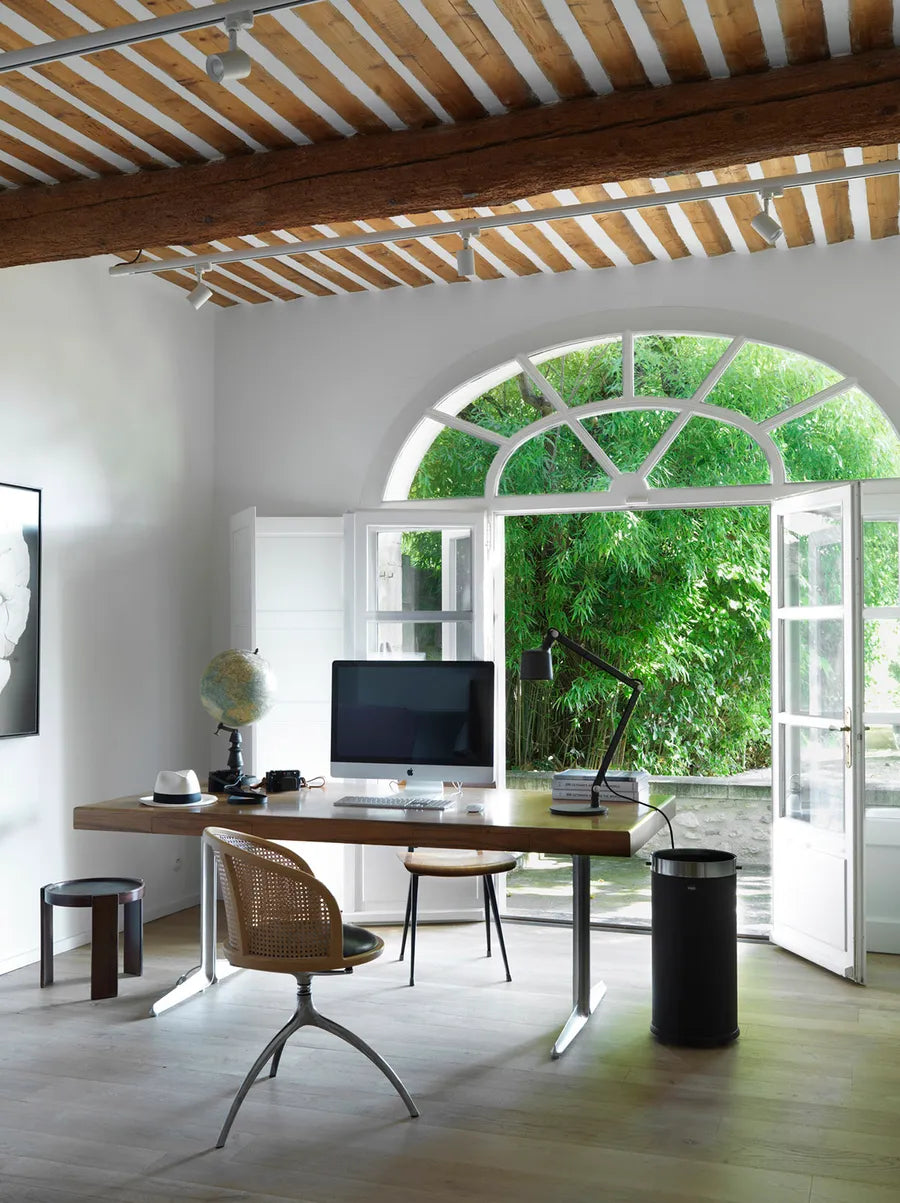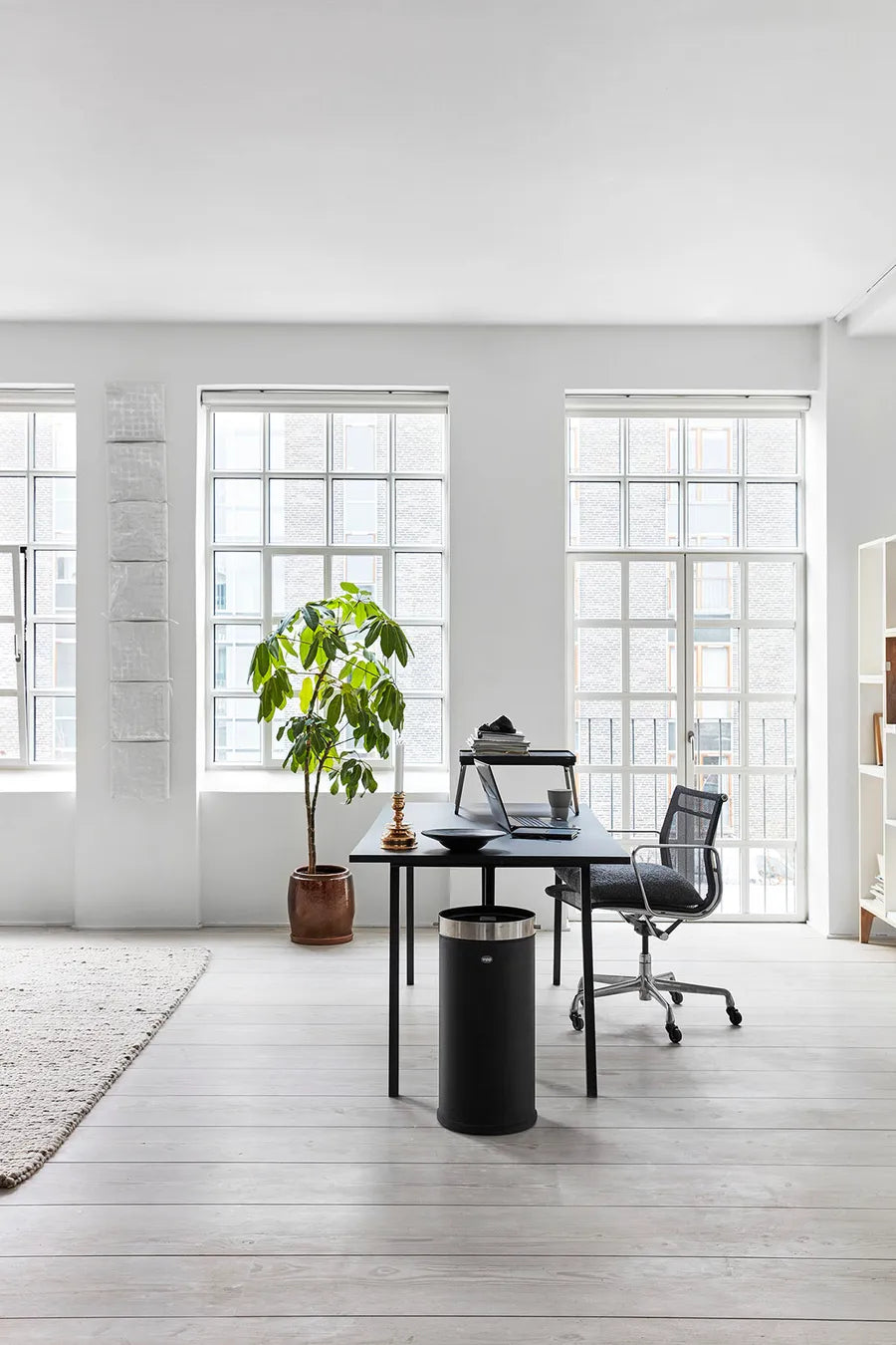 Vipp kontorspanden er en skraldespand til brug i både kontormiljøer og i hjemmet. Kontorspanden har en krop i rustfrit stål og holdbart gummi iklædt et tidløst design, og er udstyret med diskrete gummihjul. En skjult metalring holder posen på plads.