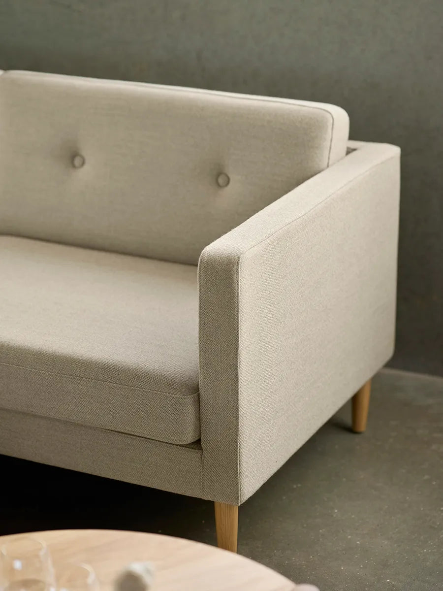 Firhøj sofaen her er betrukket med et skønt beige tekstil i en uldblanding, der sikrer dig, at du har sofaen i dit hjem i mange, mange år.