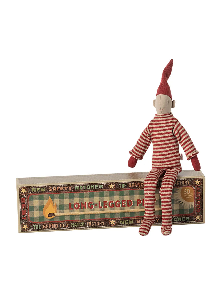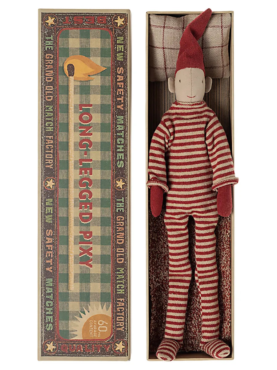 Tilføj et strejf af leg og nostalgi til julen med Mailegs Long Legged Pixy i æske. Denne lille nisse kommer i en smukt dekoreret tændstikæske, der fungerer som både seng og opbevaring. Med sine lange ben, røde nissehue og fine håndlavede detaljer er Pixy en charmerende figur, der indfanger essensen af Mailegs juleunivers. Den kompakte størrelse gør den oplagt til gave, kalenderpakke eller som pynt på en hylde. En sjov og hyggelig figur, der kan bruges år efter år som en fast del af julens traditioner.