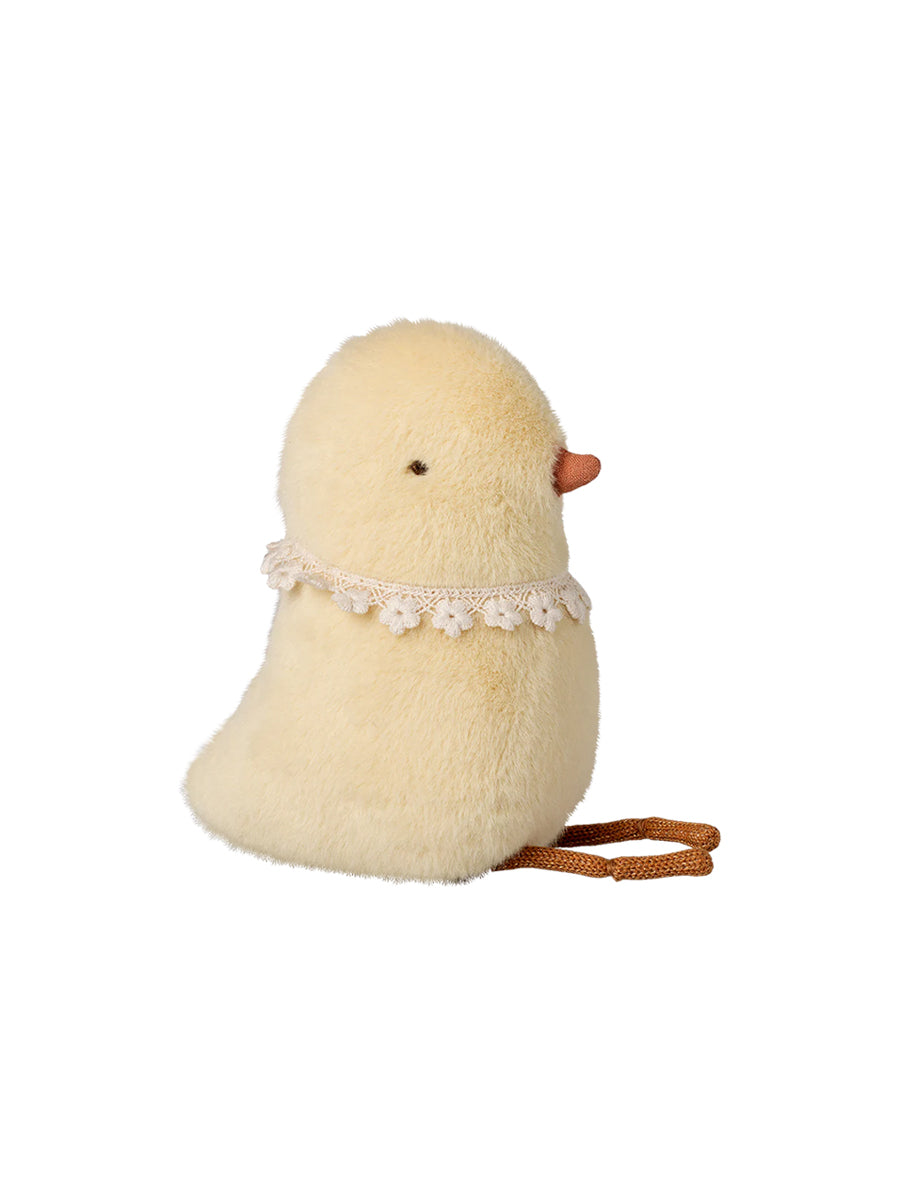 Her er den lille ven, der gør påske, puttetid og hverdagsleg ekstra hyggelig. Den lille kylling er skabt til små hænder og store kram. Den silkebløde plys giver en behagelig følelse, og det søde, rolige udtryk indbyder til omsorgsfuld leg fra første øjeblik. De fine, strikkede ben med et diskret gyldent skær tilfører et charmerende blikfang, der også gør kyllingen dekorativ på hylden, i vindueskarmen eller som en del af påskebordet. Kvaliteten er den, Maileg er kendt for: gennemtænkt design, holdbare materialer og et poetisk univers, hvor leg og indretning mødes. Den kompakte størrelse gør kyllingen nem at tage med i bilen, i klapvognen eller i kurven på børneværelset, og den passer perfekt i de ikoniske metalæg fra Maileg, så barnet kan skabe små ritualer omkring at putte, gemme og finde igen.