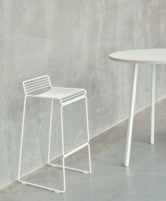 Praktisk tænkning er integreret hele vejen igennem. Ved længder som 250 cm leveres bordet med en diskret support under bordpladen der sikrer ekstra stabilitet og modvirker nedbøjning over tid. Det betyder at bordet bevarer sit stringente udtryk selv ved flittig daglig brug. Højden er optimeret til stående arbejde og til at blive kombineret med barstole i sædehøjde omkring 65 til 75 cm, fx HAY About A Stool serierne, så du frit kan veksle mellem at stå og sidde. Den grafiske lethed fra de trebenede bukke giver samtidig god benplads langs hele bordets længde, og den brede plade gør det oplagt som projektbord, ad hoc mødezone eller socialt samlingspunkt i åbne miljøer.