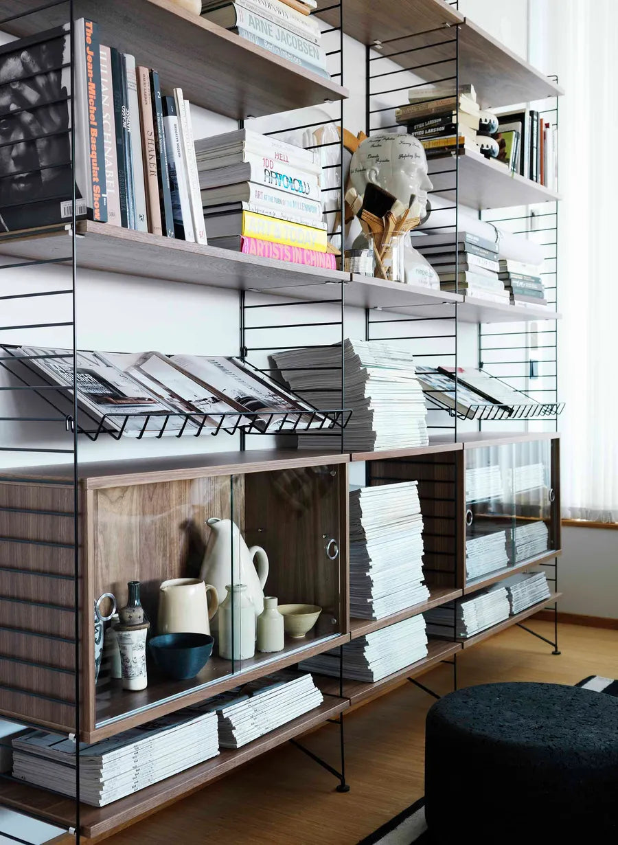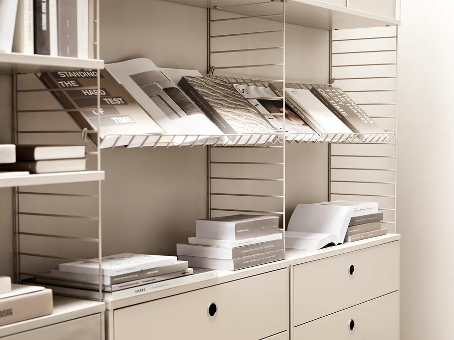 Holder til blade, bøger, aviser eller sko? Brug String hylder i metal til mange forskellige ting. Tilføj magasinholderen i hvid, grå, beige eller sort til dit String reolsystem.