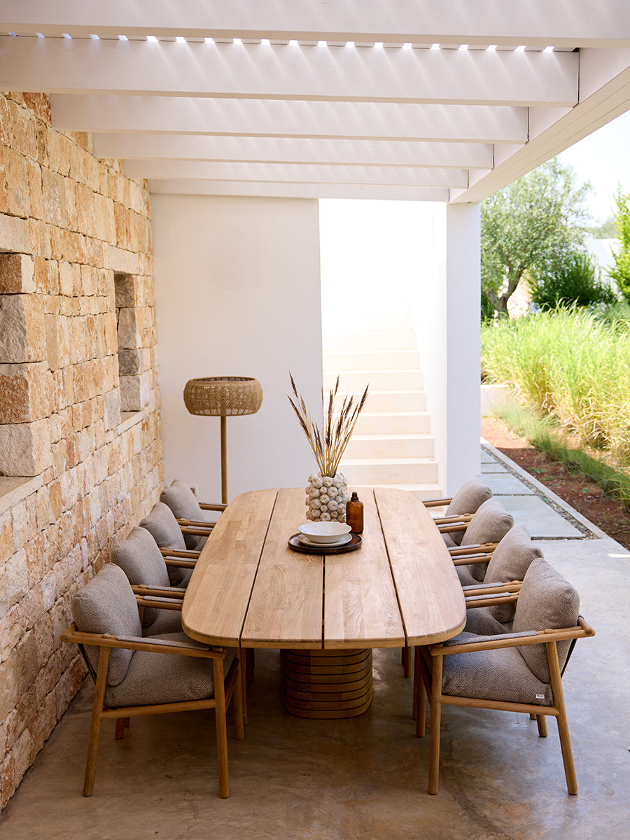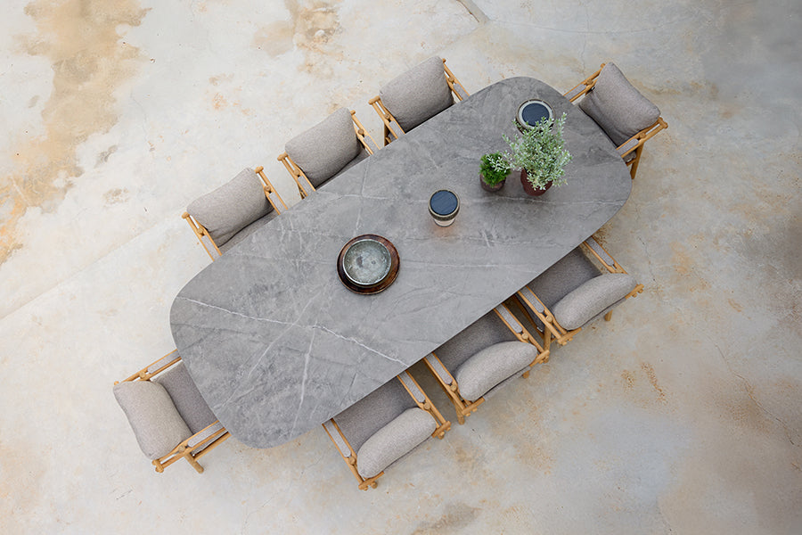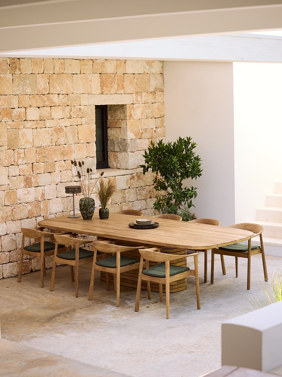 Mellow havebord, ovalt, large, fra Cane-line Design samler større selskaber i et roligt, skulpturelt udtryk. Den karakteristiske søjlebase bærer en generøs bordplade på 300 x 130 cm med blødt afrundede hjørner, der indbyder til lange middage og nærværende samtaler. Alle varianter har base i teak, og du kan vælge bordplade i teak eller keramik i Taupe eller Travertine look. Vælg materiale og udtryk, og skab et harmonisk midtpunkt på terrasse, i gårdhave eller på tagterrasse.