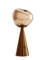 Melt Portable bordlampe i bronze fra Tom Dixon forener skulpturel effekt og daglig funktion i en lille, fleksibel størrelse. Den ikoniske, forvrængede sfære får rummet til at gløde med en dyb, varm metallisk tone, der minder om smeltet chokolade. Når lampen er tændt, opstår den velkendte “hot-blown glass”-illusion med levende reflekser; slukket står skærmen som et spejlblankt objekt, der elegant spejler omgivelserne. Den bærbare udgave er skabt til at flytte rundt – fra spisebord til altan og fra loungen til soveværelset – uden kabler, installation eller kompromis med stemningen. Batteriet giver op til en hel aften på én opladning, og en praktisk tretrins-dæmpning gør det nemt at skifte fra hyggelys til mere fokuseret belysning. IP44-kapslingen betyder desuden, at lampen tåler brug både inde og ude, så længe den opbevares indendørs. Materialet er avanceret polykarbonat, formet i Tyskland med injection blow moulding og efterfølgende vakuummetallisering, som giver den karakteristiske halvmetalliske overflade og det dybe bronzespil. Resultatet er en kompakt designlampe, der emmer af Tom Dixons signatur – teknologisk kunnen, stærk materialefornemmelse og et strejf af luksus, der klæder alt fra minimalisme til mere klassiske interiører.