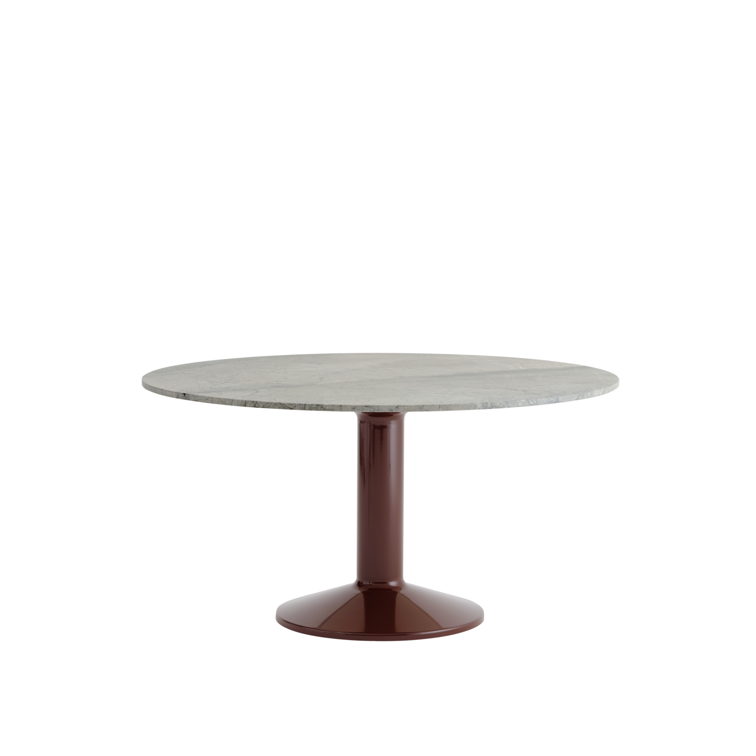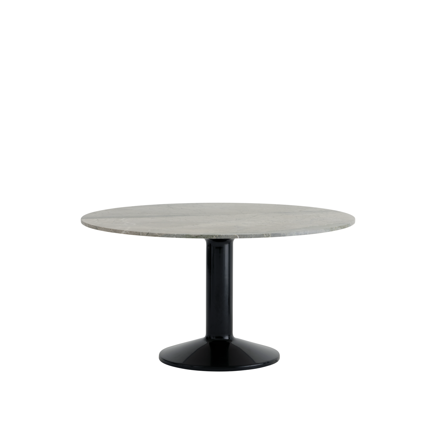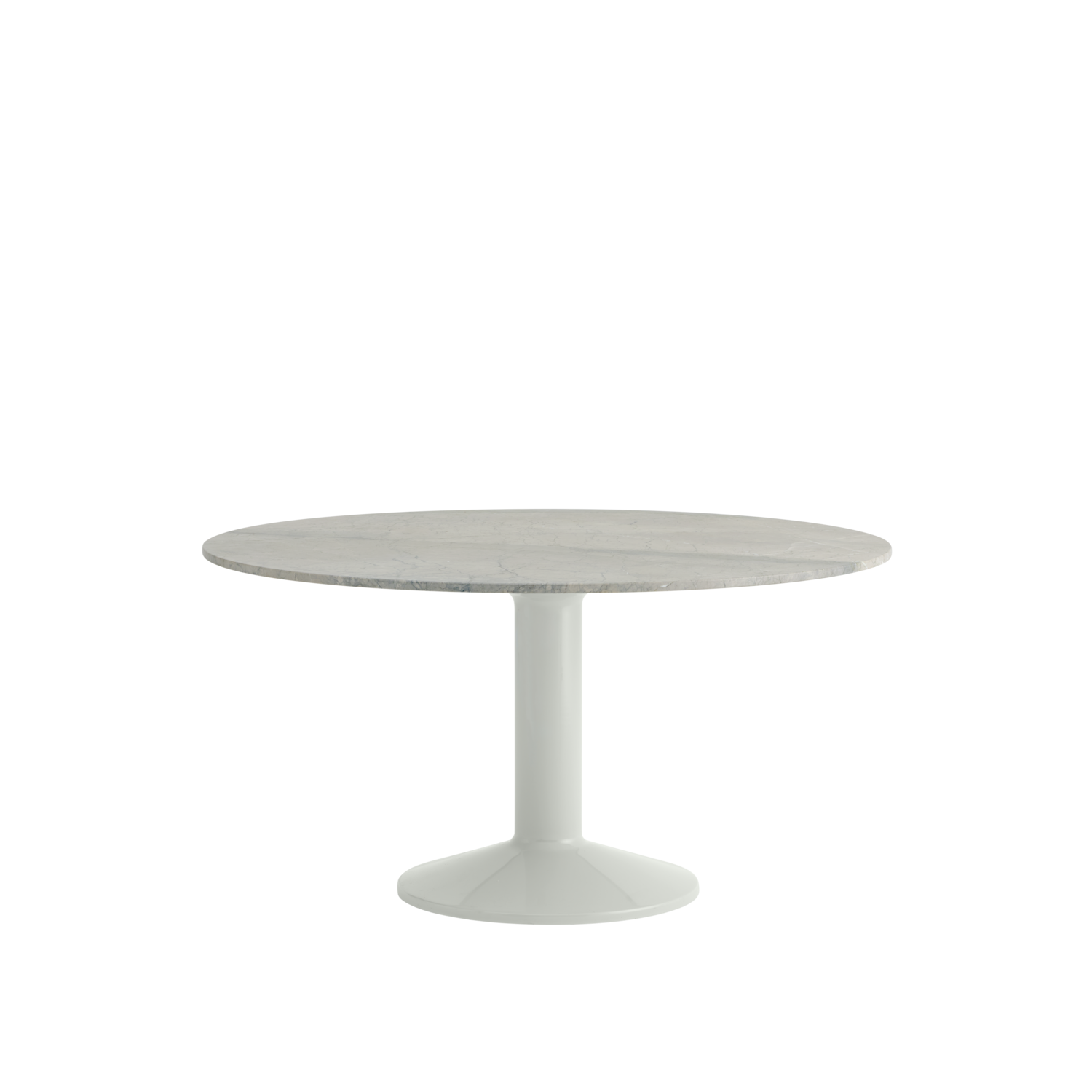 Midst Table fra Muuto samler mennesker omkring et rundbord med skulpturel ro. Den monolitiske stålsokkel giver luft omkring stolene, mens bordpladen i honet marmor eller mørkolieret eg tilfører taktil kvalitet og et tidløst udtryk. Designet af TAF Studio og skabt til hverdagens måltider såvel som gæstemiddage.
