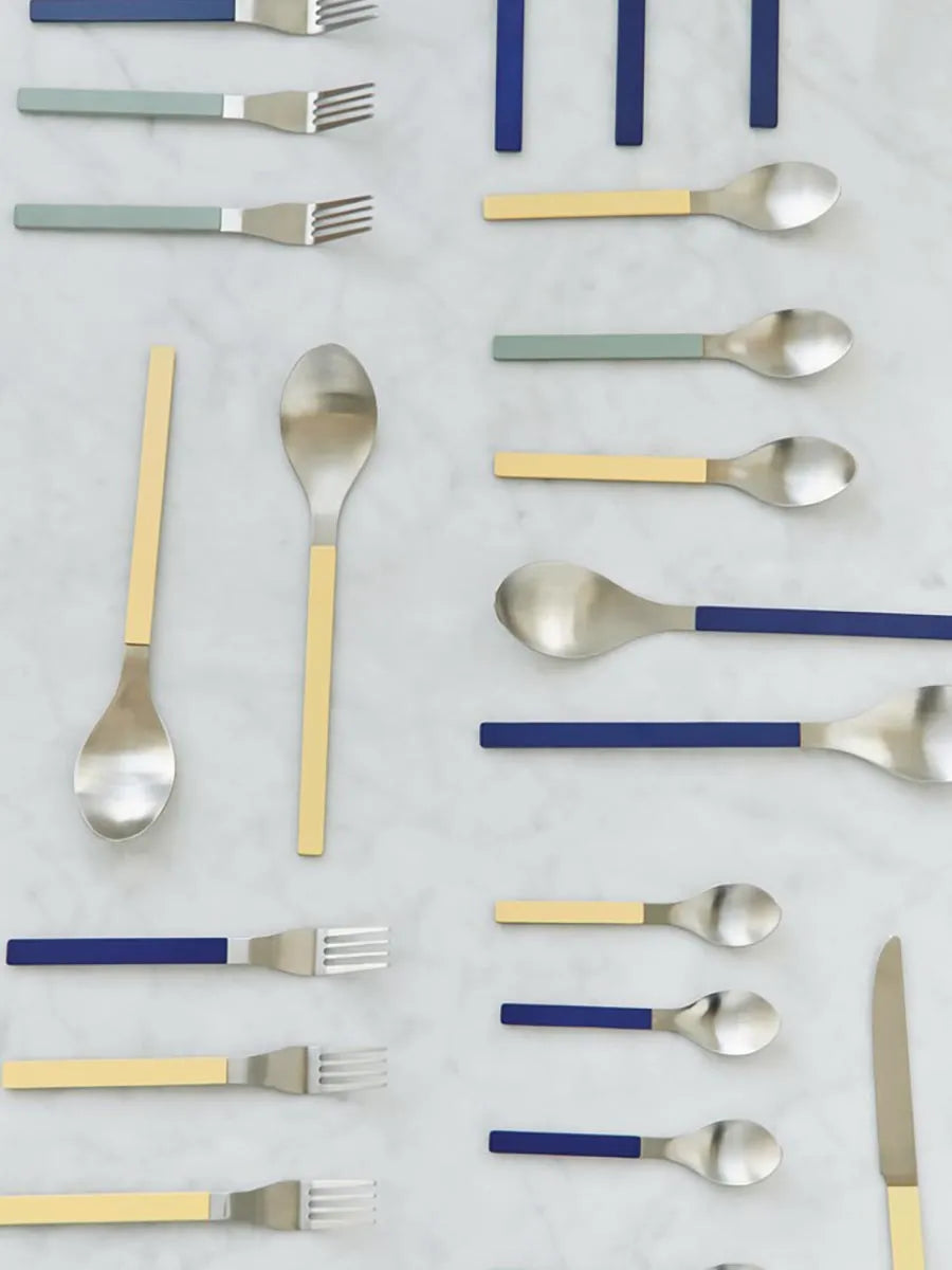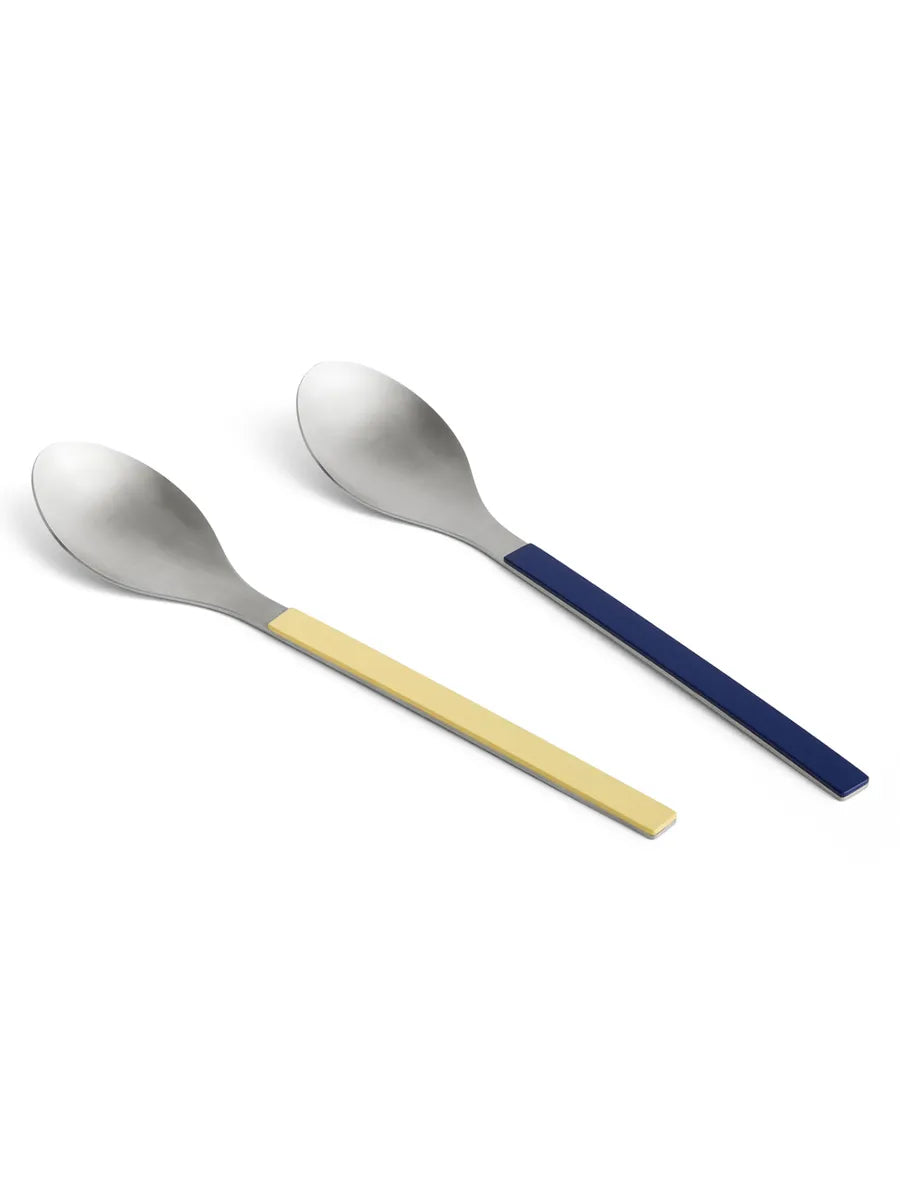 Den fine og farverige MVS serie rummer både spisebestik, men også serveringsskeer. Her et sæt af 2 serveringsskeer til eksempelvis salat i et skønt mix af gult og blåt. Skeerne er i rustfrit, børstet stål, som tåler opvaskemaskine.
