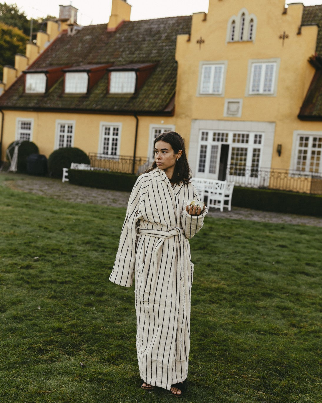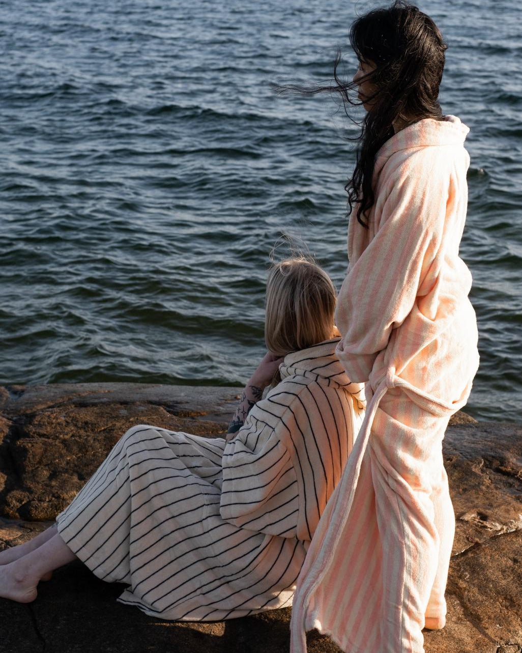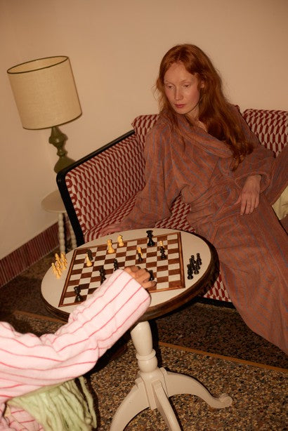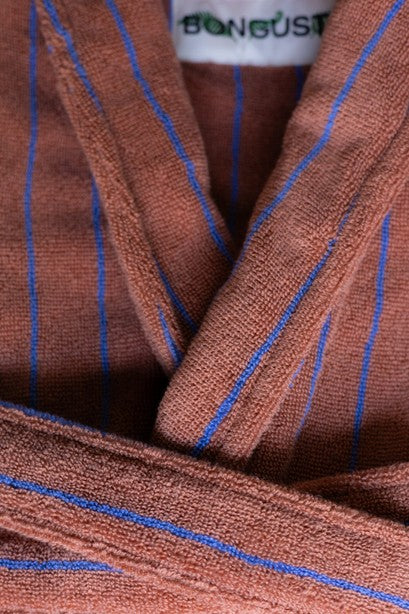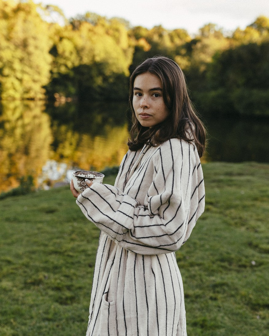 Svøb dig i Naram badekåben fra Bongusta i farven creme & ink – en blød, absorberende frotté i 100% kæmmet OEKO-TEX® bomuld, vævet i 385 g/m² for høj komfort og holdbarhed. Den lange, unisex pasform er skabt til rolige morgener og stunder efter badet: sjalkrave, åben front, to rummelige lommer og et kraftigt bindebælte giver både funktion og luksus i hverdagen. Længden er tænkt til fuld dækning; er du over 176 cm eller ønsker et løsere udtryk, anbefales L/XL. Naram fås i to størrelser, og længden måles fra nakke til bundsøm: S/M 122 cm og L/XL 138 cm. Den kæmmede kvalitet polerer fibrene for glans og en silkeblød fornemmelse, og kåben kan vaskes ved 60°; ophængsløkke i kraven gør hverdagen nem. Kort sagt: tidløs, farverig velvære fra Bongusta.
