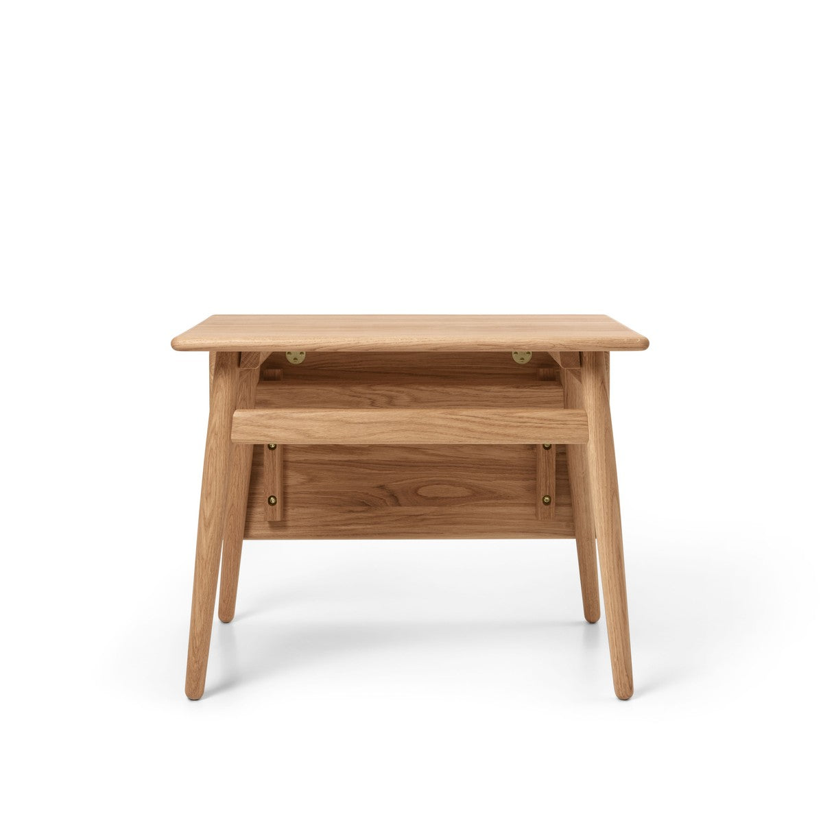 ND55 sofabord i olieret valnød destillerer Nanna & Jørgen Ditzels legende funktionalitet i et kompakt format med stor effekt. De bløde hjørner og de afrundede kanter giver et venligt, organisk udtryk, mens de børstede messingdetaljer tilfører diskret elegance. Bordpladen rummer en integreret udtræksklap, der giver ekstra plads til kaffekopper, gæsternes glas eller dagens avis – og glider sømløst tilbage, når der skal være luft i indretningen. Udført i massivt valnød og produceret i Danmark, er ND55 skabt til at blive brugt hver dag og patinere smukt over tid. Et tidløst stykke dansk design, der står lige flot alene eller sammen med ND52 Vita-sofaen.