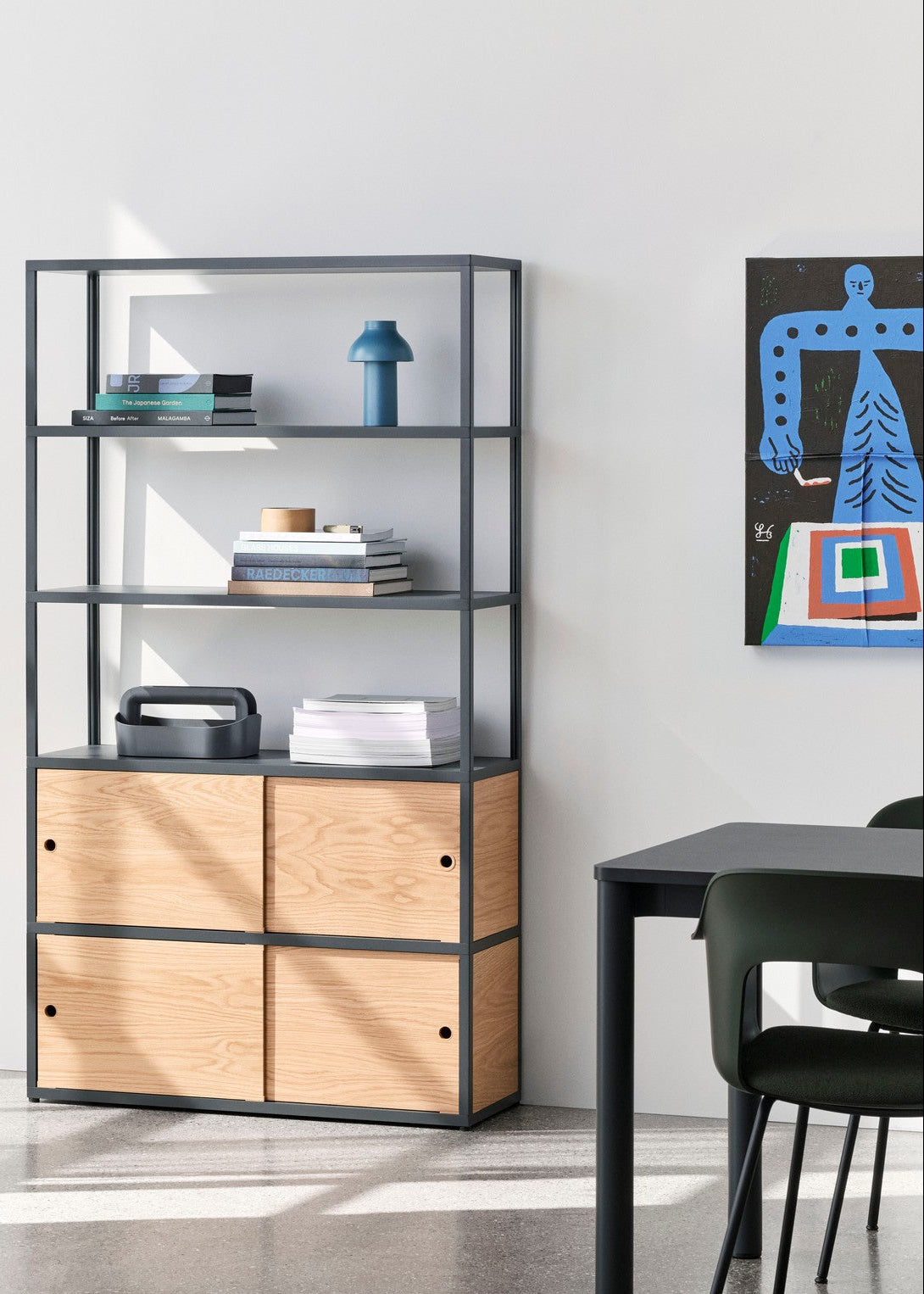 Kombi 503 er et højt, rummeligt møbel med åbne hylder til bøger, mapper og objekter, kombineret med to store trælåger, der skaber et roligt og sammenhængende frontudtryk og skjuler det, der ikke behøver stå fremme. Proportionerne gør reolen oplagt som solitær i stuen, som velorganiseret opbevaring i kontoret eller som diskret rumdeler. Den lette konstruktion står visuelt slankt, men er udviklet til professionel brug og testet efter internationale standarder for styrke og holdbarhed, så du kan indrette trygt i mange år. HAY arbejder samtidig med certificerede materialer og dokumenteret kvalitet, så du får et møbel med lav vedligeholdelse og lang levetid.