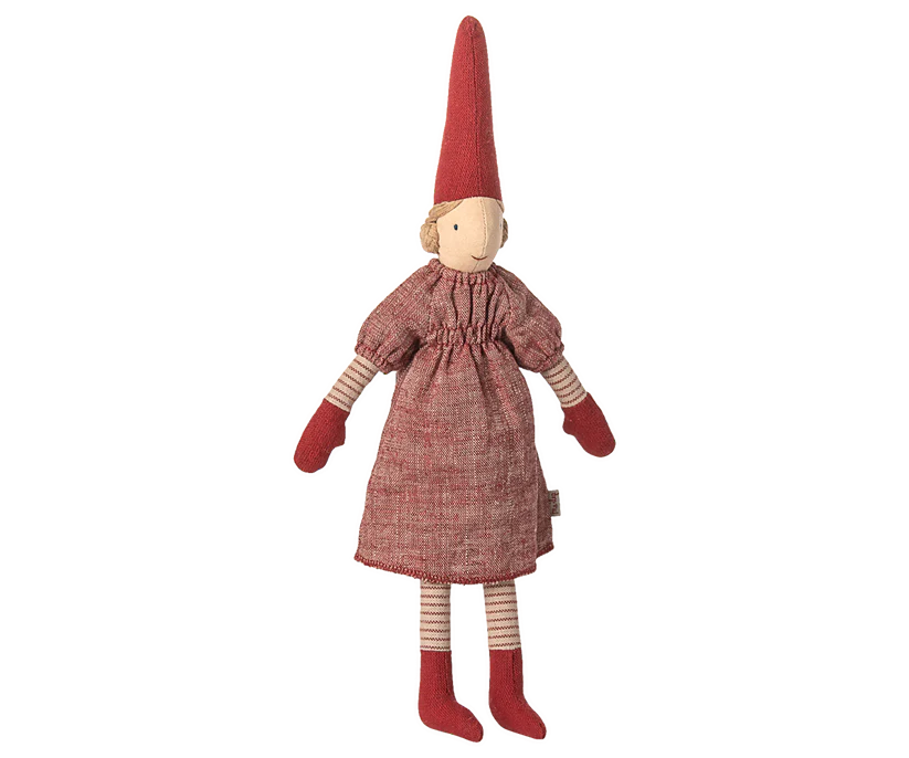 Forestil dig en lille juleven, der bringer varme og nærvær ind i hvert hjørne af hjemmet – det er præcis, hvad denne nissepige fra Maileg gør, iført en klassisk rød kjole og med et venligt smil på læben. Med sin tidløse charme og høje kvalitet bliver hun hurtigt en del af dine juletraditioner, klar til at sidde på hylden, ved pejsen eller på børneværelset og sprede hygge og eventyr i decembermånederne.