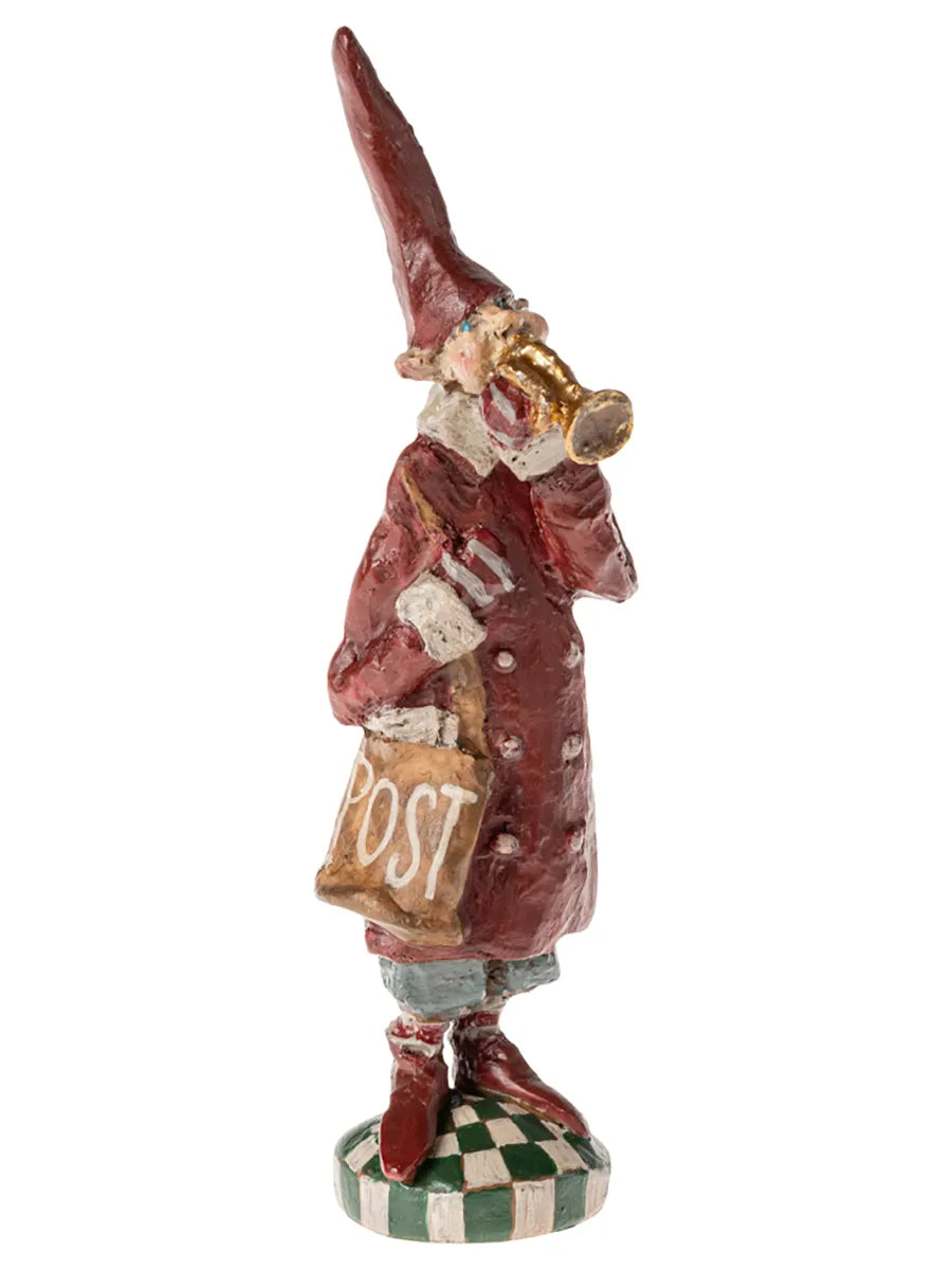 Et Maileg samleobjekt. Hvert år designer Maileg en ny og unik nisse. Denne smukke årsnisse er formet i hånden og bagefter håndmalet. Hver Maileg nisse har sit eget unikke udtryk og er pakket i en flot gaveæske. Figuren her er en postnisse, der trutter i et horn.