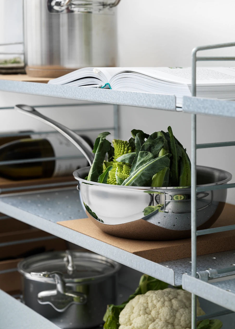 String Outdoor B er en kompakt og utrolig anvendelig udendørs reolløsning til dig, der vil have orden på altan eller terrasse uden at gå på kompromis med æstetikken. Kombinationen er skabt til udendørs brug i galvaniseret stål, så du får en robust opbevaring, der tåler sæsonernes skiften og samtidig udvikler en smuk patina med tiden. De to hylder med høj kant giver ekstra tryghed til krukker, krydderurter og småredskaber, mens hylden med lav kant gør det nemt at skabe en let og indbydende styling med bakker, lanterner eller servering til sommeraftener.