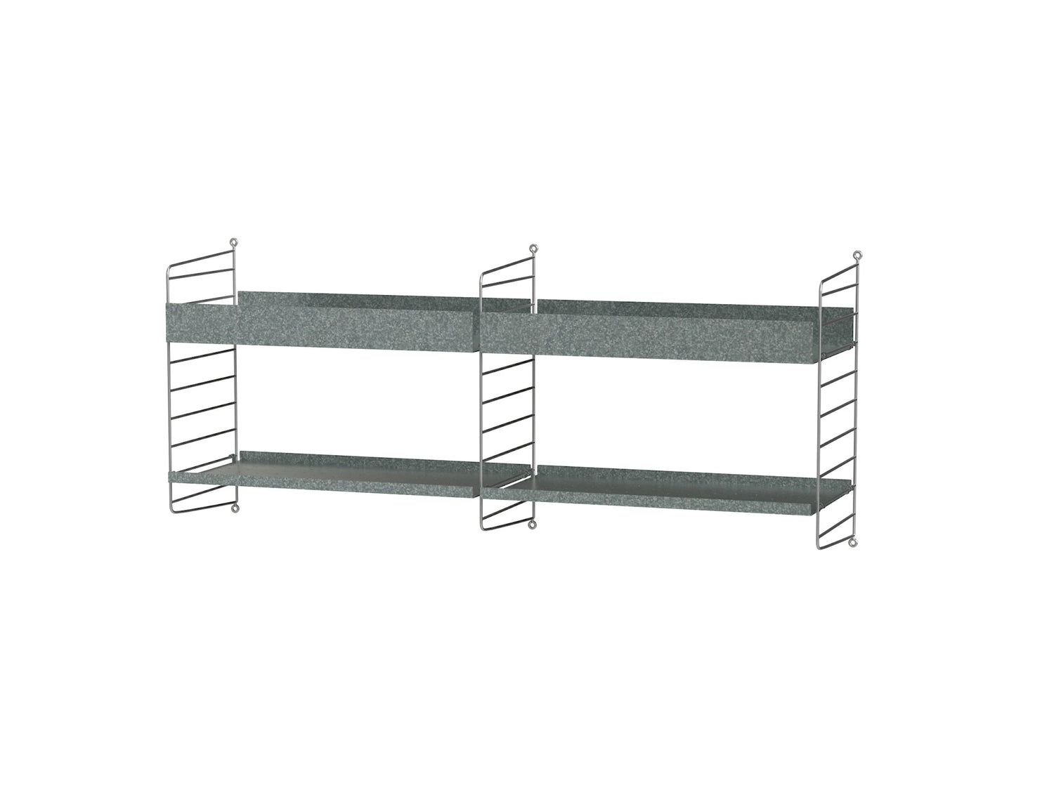Outdoor F fra String er til dig, der vil have samme rene, skandinaviske orden udenfor, som du elsker indenfor. Kombinationen giver en generøs væghængt opbevaringsløsning i to sektioner, perfekt til altanen, terrassen eller ved udekøkkenet, hvor du gerne vil have potter, krydderurter, lanterner og redskaber lige ved hånden. De galvaniserede paneler og hylder er skabt til at tåle vind og vejr, og overfladen ændrer sig naturligt over tid, så reolen får en levende patina, der klæder udemiljøet og gør udtrykket endnu mere autentisk.