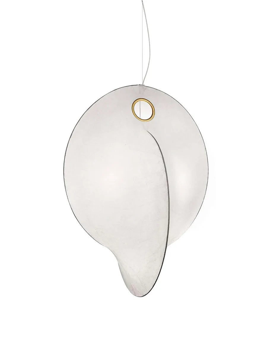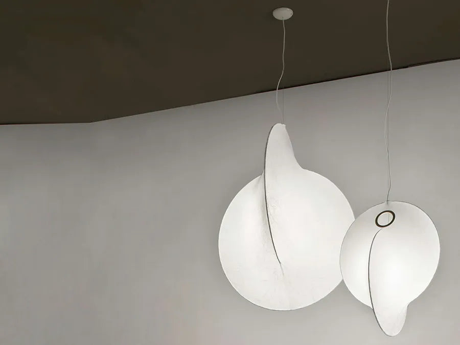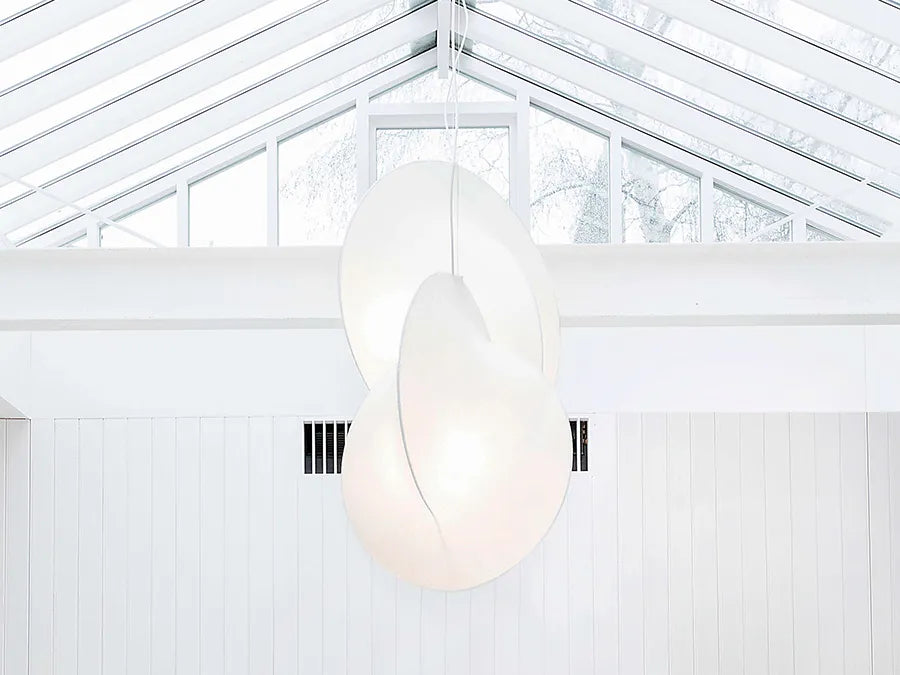 Overlap Suspension lampen giver et skønt lys, der er blødt og behageligt. Lyset blødes op af den særskilte skærm i Cocoon, et helt unikt materiale, som er sprøjtet på det hvide metalstel. Overlap pendlen er noget for sig og i sandhed en lampe, der er unik. Brug den over en køkken-ø eller som spisebordslampe for et smukt og rent look.