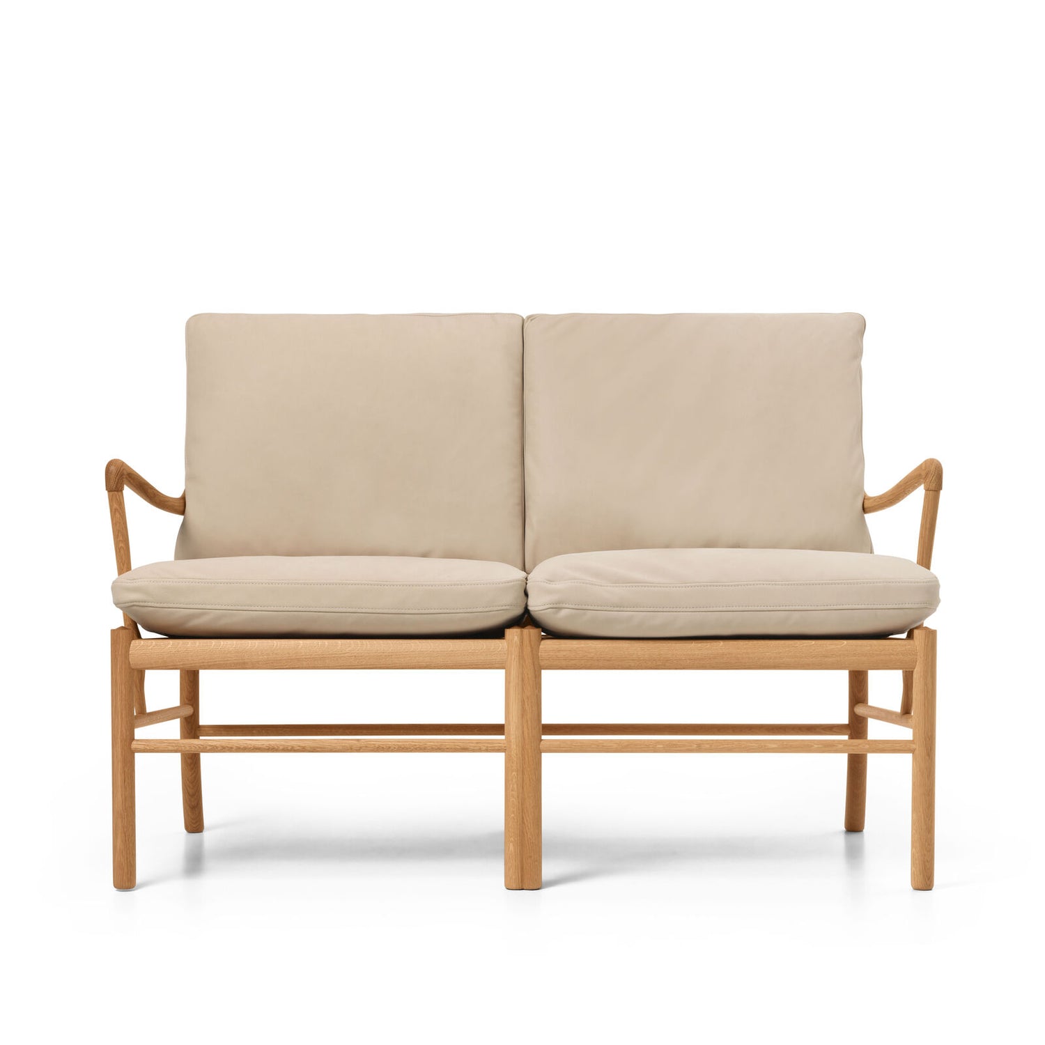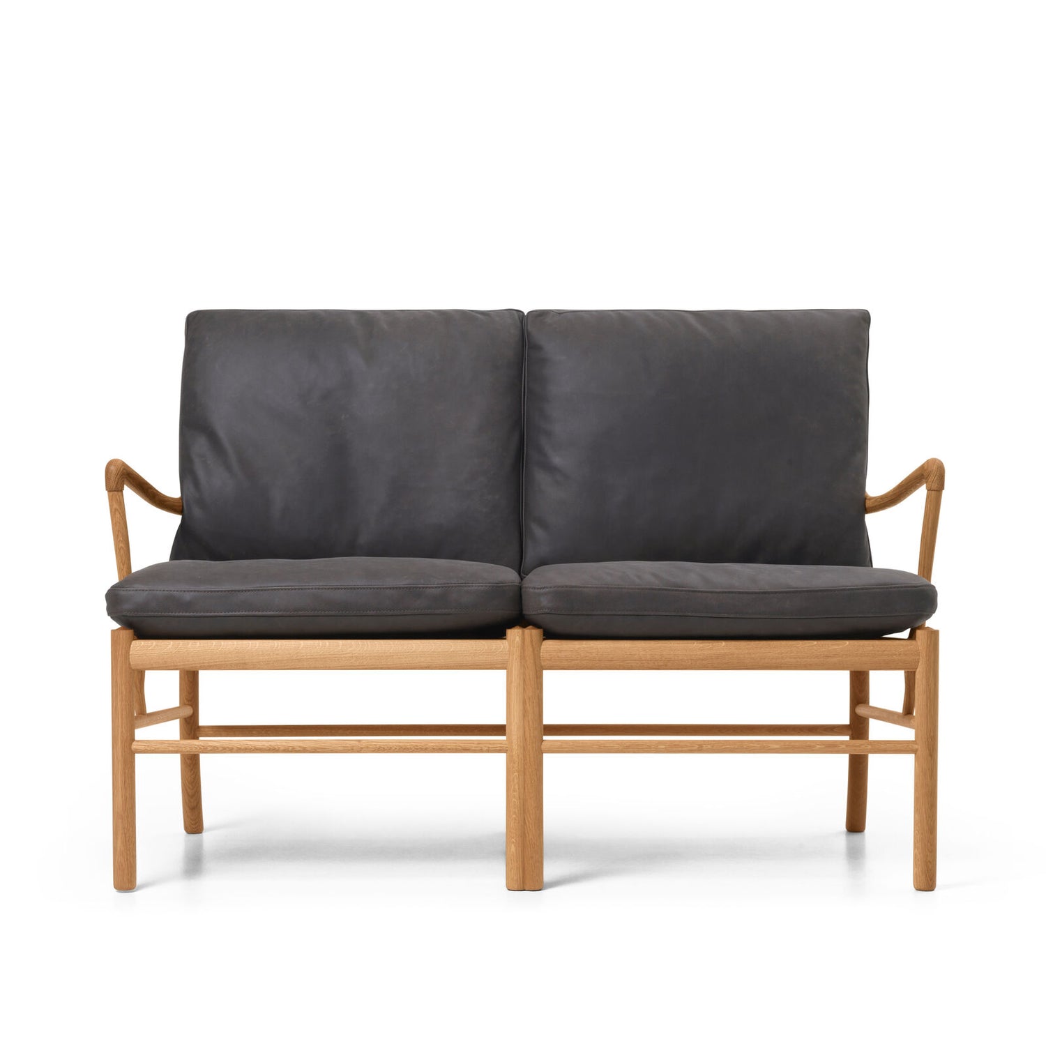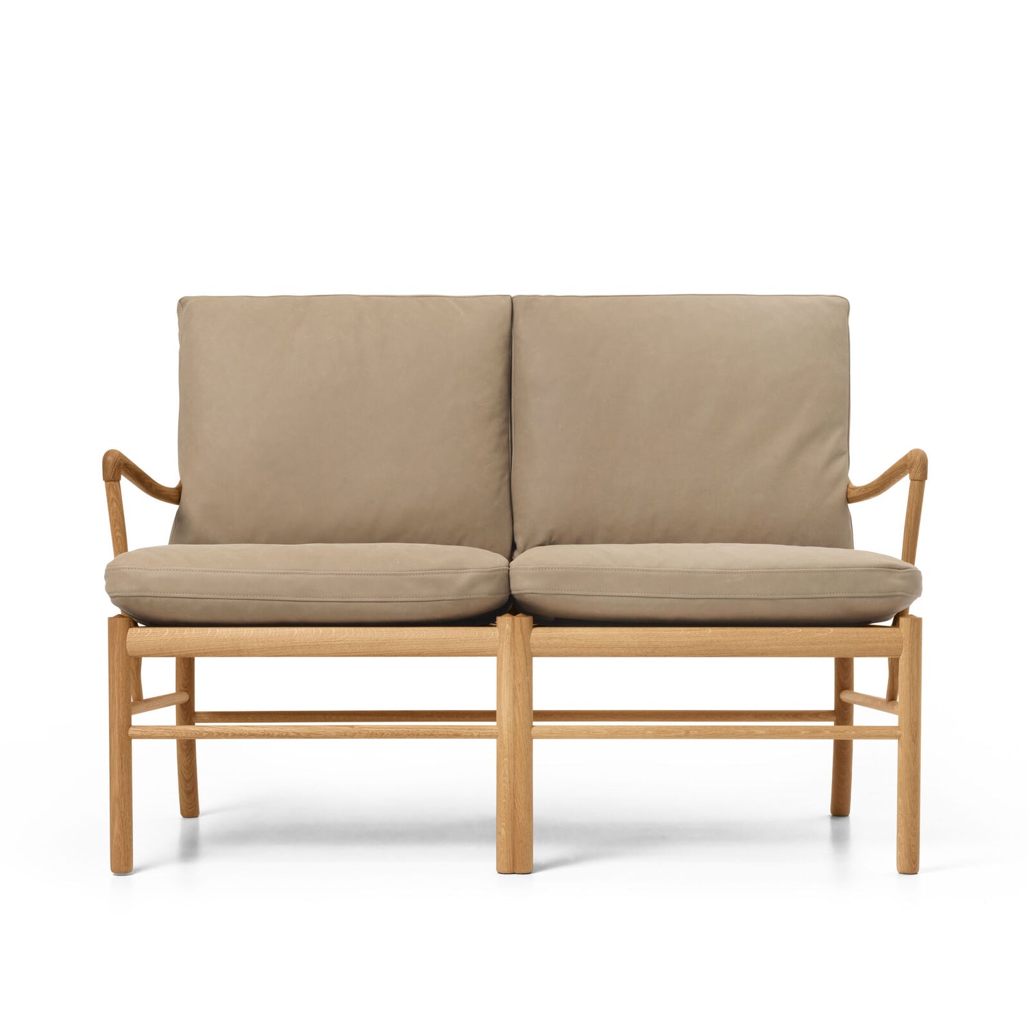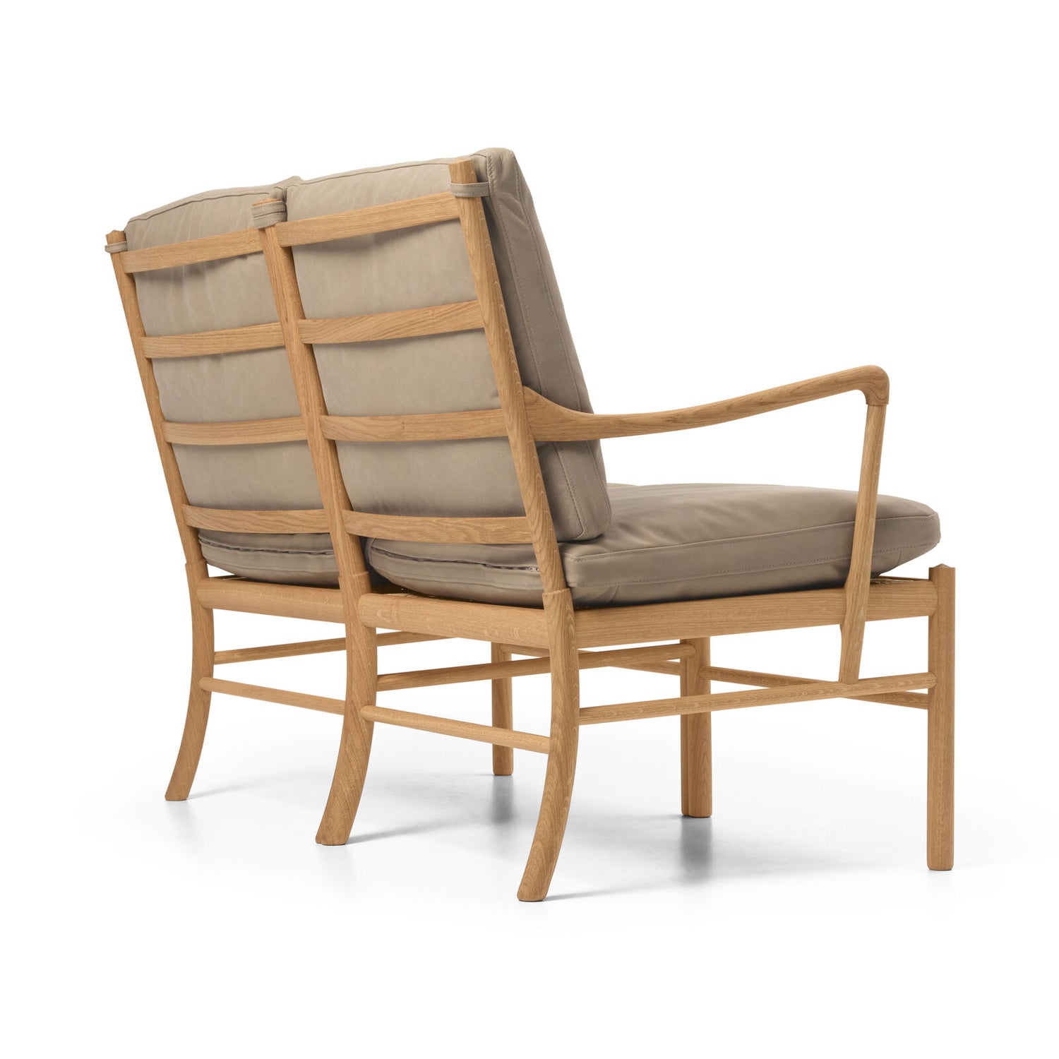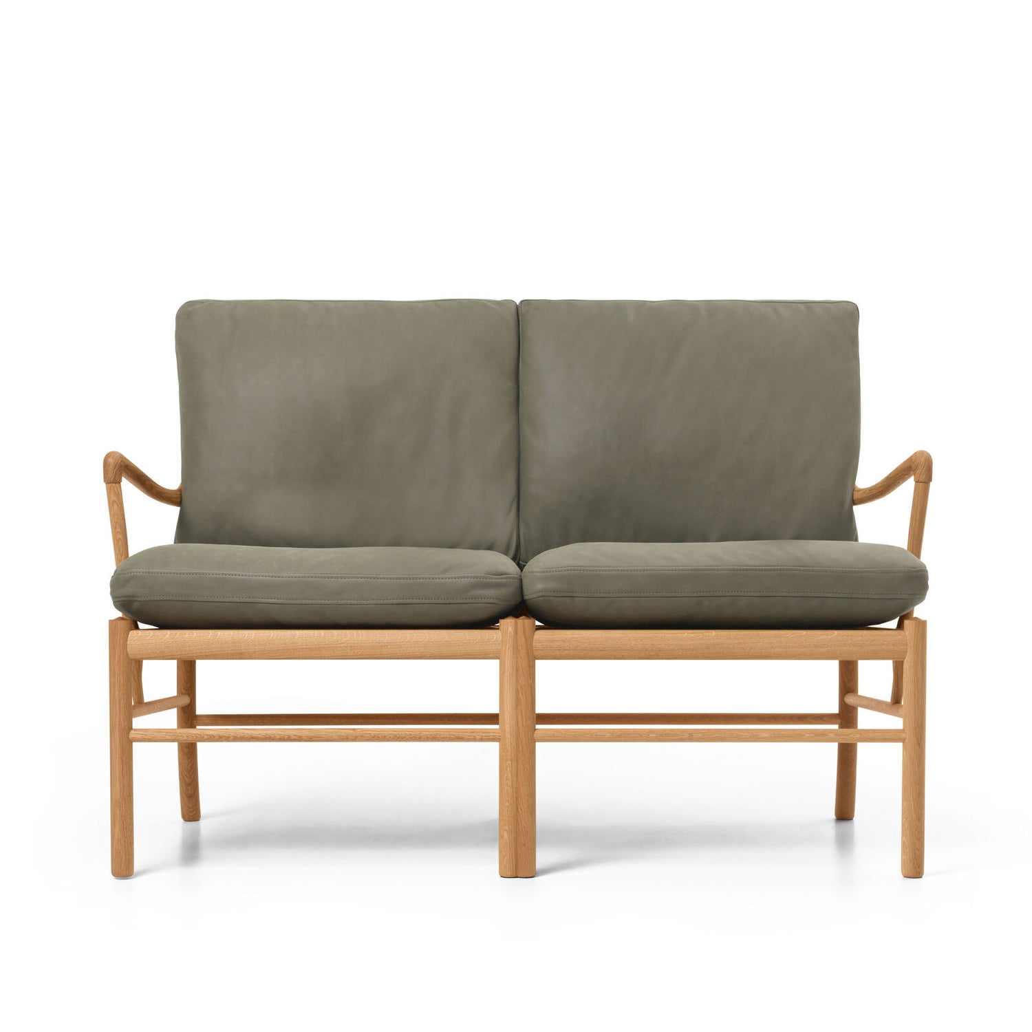OW149-2 Colonial sofa i eg olie med TERRA®-læder forener Ole Wanschers raffinerede minimalisme med nutidig komfort. De slanke proportioner og let buede armlæn giver et let, klassisk udtryk, mens de løse, luksuriøse hynder inviterer til afslapning. Den elegante gitterkonstruktion med dobbelte centerben skaber styrke uden at virke tung, og sædet hviler frit i stellet på en base af bomuldsgjorde – en detalje, der kan mærkes i den bløde, fjedrende komfort. TERRA®-læderet fra Sørensen Leather har en silkemat, taktil overflade i rolige jordtoner, der patinerer smukt over tid. En tidløs 2-pers. sofa, der står stærkt alene eller som makker til Colonial Chair og fodskammel.