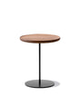 Bordet kan vælges med bordplade i eg eller valnød og stel i sort eller rustfrit stål i tre højder.