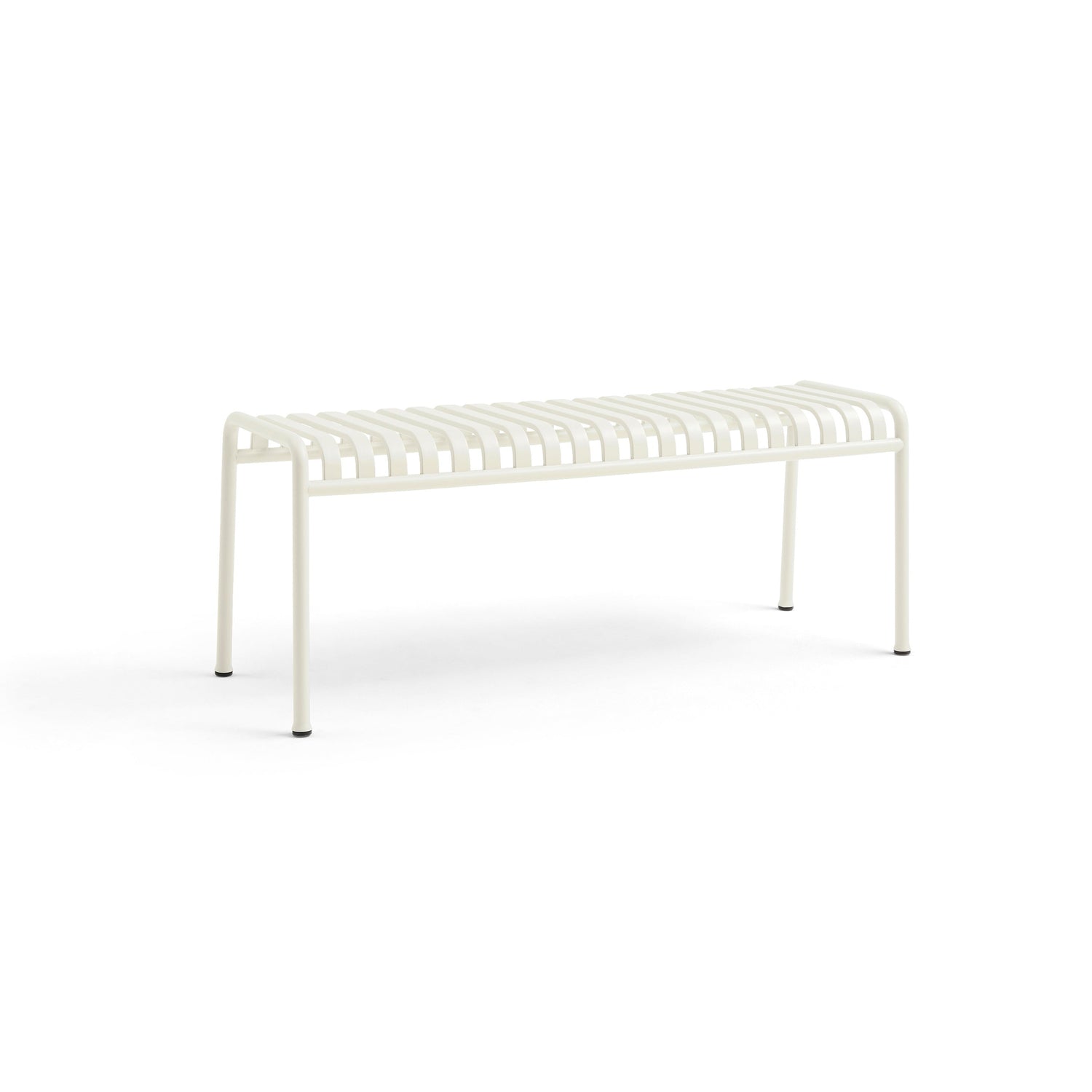 Designet er gennemført ned til detaljen. Lamellerne lader regnvand løbe af, så bænken tørrer hurtigt, og overfladen er pulverlakeret med en vejrbestandig finish, der er udviklet til udendørs brug. Det betyder minimal vedligeholdelse i hverdagen og en overflade, der holder sig pæn sæson efter sæson. Den velafbalancerede geometri giver en behagelig, naturlig siddeoplevelse med blid fleks i sædet, og stålrammen sikrer, at bænken står stabilt uden at virke tung. Brug den alene som et skulpturelt element eller kombiner med Palissade Dining Chair, Armchair eller et Palissade Table for et stringent og sammenhængende udtryk i hele zonen. Farven cream white er særlig taknemmelig i nordiske uderum, hvor lyset skifter over dagen og fremhæver de bløde kurver i serien.