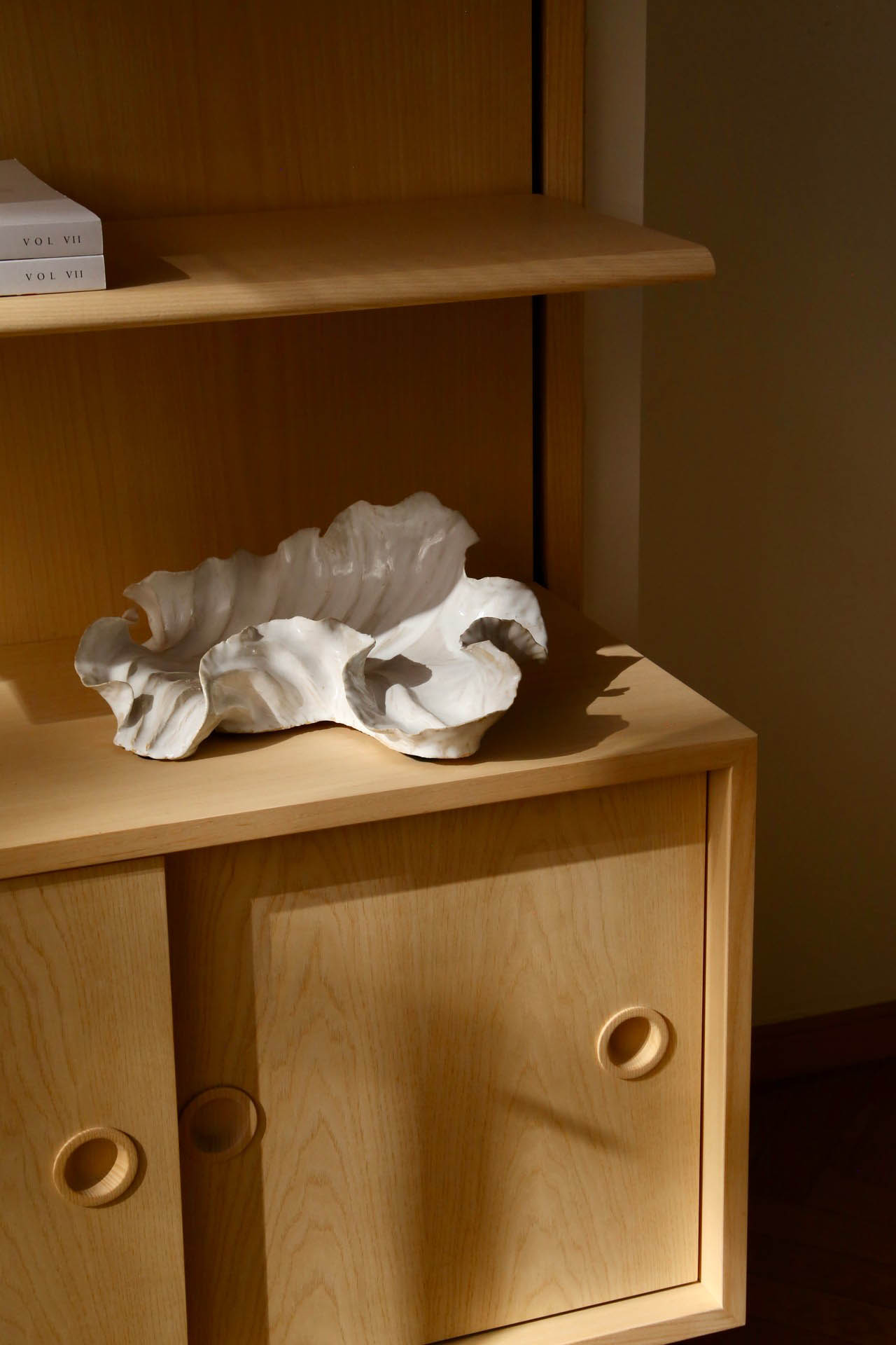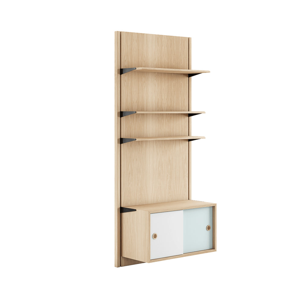 De tre hylder er valgt i 28 cm dybde, som giver ekstra plads til bøger, keramik og hverdagsobjekter uden at virke tungt. Skabet samler diskret de ting der helst skal være væk fra synet og de brunerede stålbærere tilføjer en raffineret detalje der understreger den håndværksmæssige kvalitet. Panel System er samtidig modulært så du nemt kan flytte hylder og skabe efter behov og lade løsningen udvikle sig med din bolig. Hver komponent er fremstillet på House of Finn Juhls eget værksted i Ringkøbing med fokus på varige materialer og en finish som kan holde i generationer. Designet er et skoleeksempel på Juhls humanistiske tilgang hvor møbel og arkitektur smelter sammen til en harmonisk helhed. Resultatet er en let svævende reol som både organiserer og iscenesætter dine ting med ro og præcision.