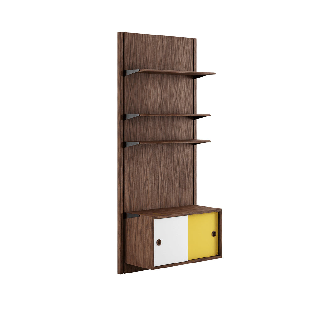 Skab en varm og arkitektonisk ro i rummet med Finn Juhls ikoniske Panel System i konfiguration 1A udført i valnød. Systemet er tegnet i 1953 og genintroduceret for at give vægge en aktiv rolle i indretningen. Her får du en elegant, væghængt løsning hvor proportioner, materialer og funktion går op i en højere enhed. 1A består af én slank panelplade i fuld højde med tre hylder og et lille skab med skydelåger. I valnød fremstår systemet med en naturlig glød og en taktilitet der spiller smukt sammen med både moderne og klassiske møbler.