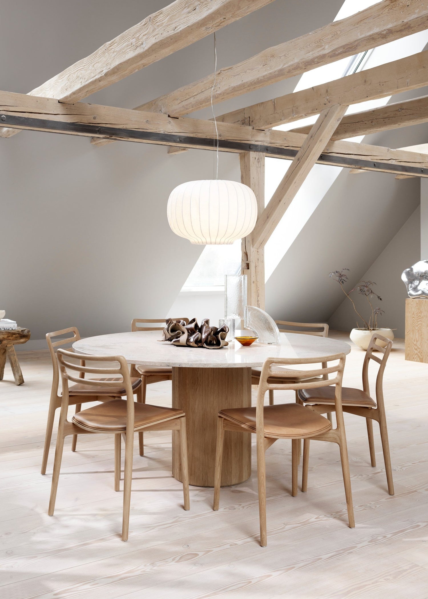 Vipp Paper pendlen er en lampe til spisestuen. Pendlen har en tekstureret papirlampeskærm og et indvendigt metalgitter. Papiret er forbundet med en monteret topring af mørk eg og giver en varm spredning af lys. Vipp Paper-pendlen er understøttet af justerbare ledninger og en gennemsigtig ledning, der er ideel til at bruge over et spisebord. Materiale: Pulver-lakeret aluminium, papir, eg. Mål: Ø: 45 x H: 30.5 cm. Inkl. 6 m. ledning. Model: VIPP586 Lyskilde: E27 MAX 60W. *Se på indersiden af ​​din lampeskærm for detaljer.