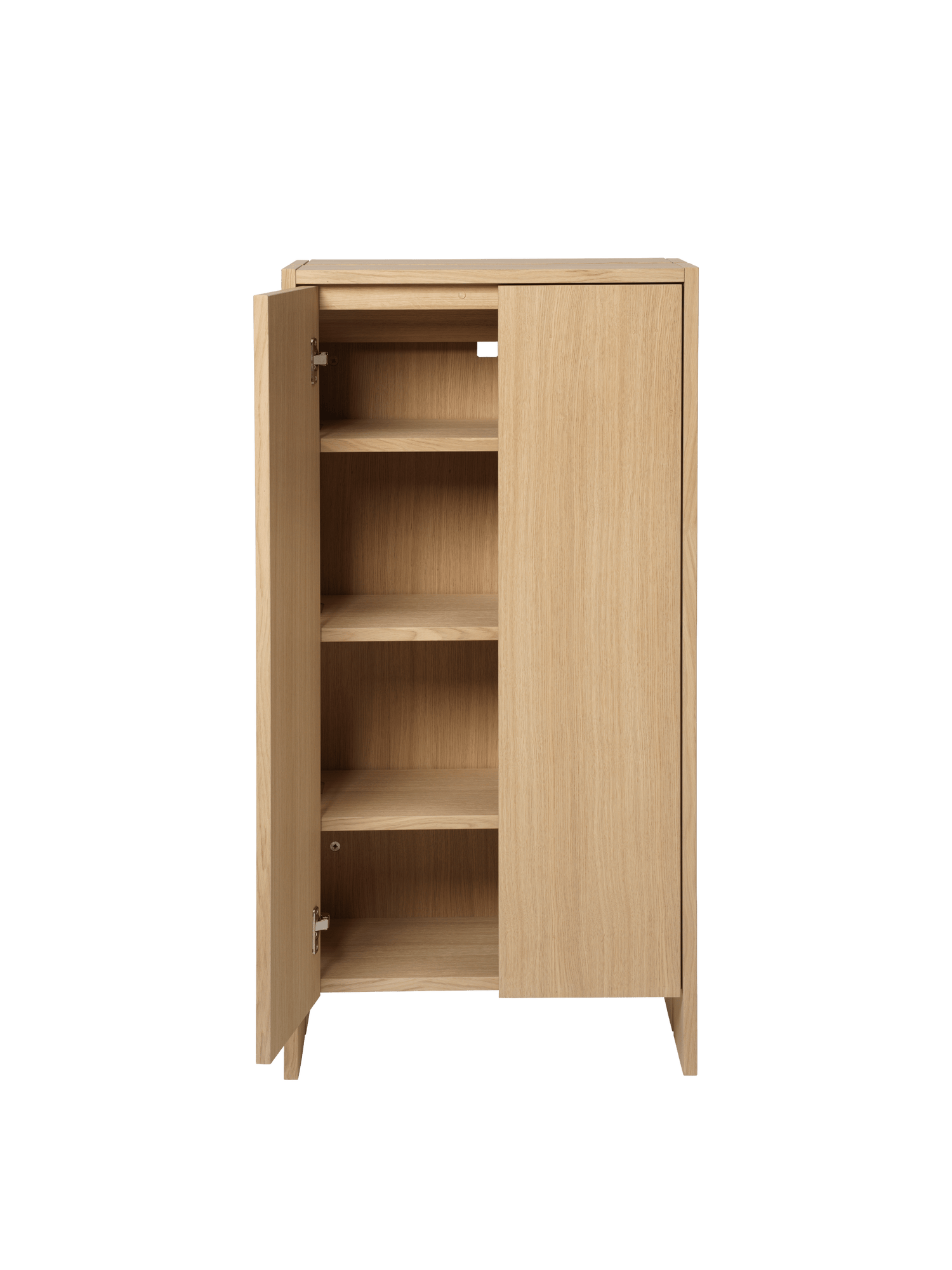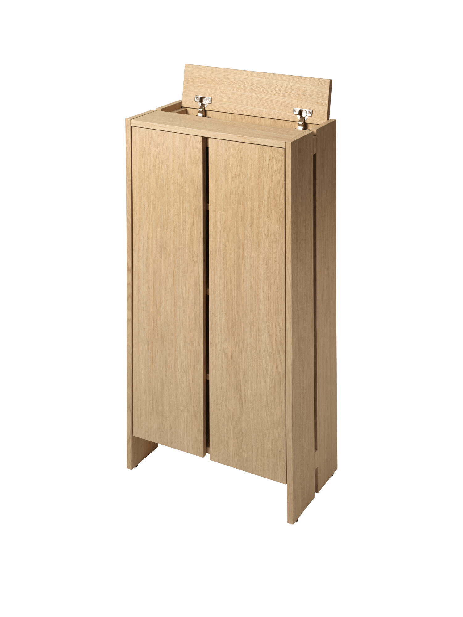 Indvendigt er skabet indrettet med hængslede hylder, der kan vinkles, så du kan organisere sko smart og udnytte pladsen optimalt. Øverst er der et separat rum, som er perfekt til hverdagens små nødvendigheder som nøgler, solbriller, hundesnor eller post, så du altid har det vigtigste lige ved hånden. Små åbninger i konstruktionen giver en let ventilation, hvilket er en skøn detalje i en travl entré, hvor sko ofte sættes væk i farten.