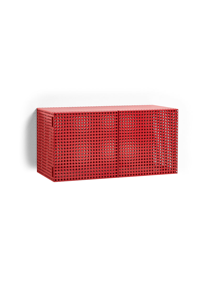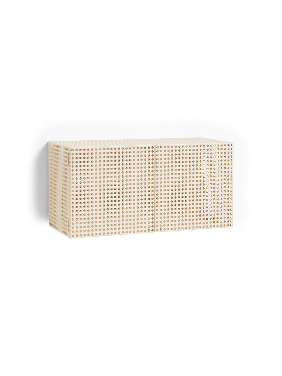 Perforated Cabinet Wall fra HAY er et væghængt skab fremstillet i pulverlakeret stål og er kendetegnet ved sit karakteristiske perforerede mønster, som skaber en let, semi-transparent effekt. Det luftige design skjuler indholdet uden at lukke det helt inde og tilfører rummet et grafisk og stilrent udtryk.