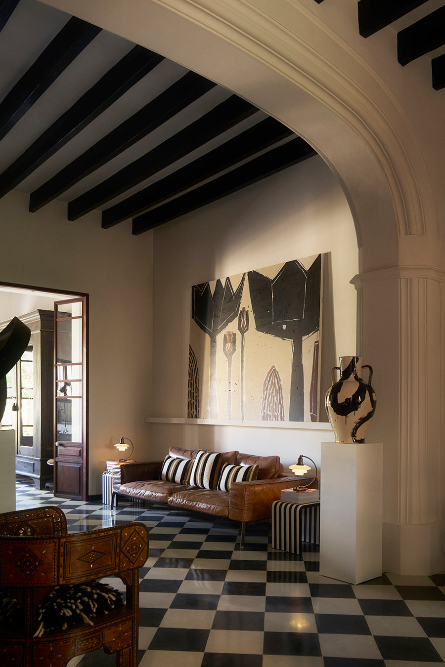 Lampen er udført i bruneret messing og mundblæst opalglas, og den brunerede overflade er lakeret for at bevare sit særlige udtryk. Det kompakte tre-skærmsdesign sikrer et blødt og blændfrit lys, mens lampens karakteristiske form tilføjer raffineret personlighed til både klassiske og moderne rum.