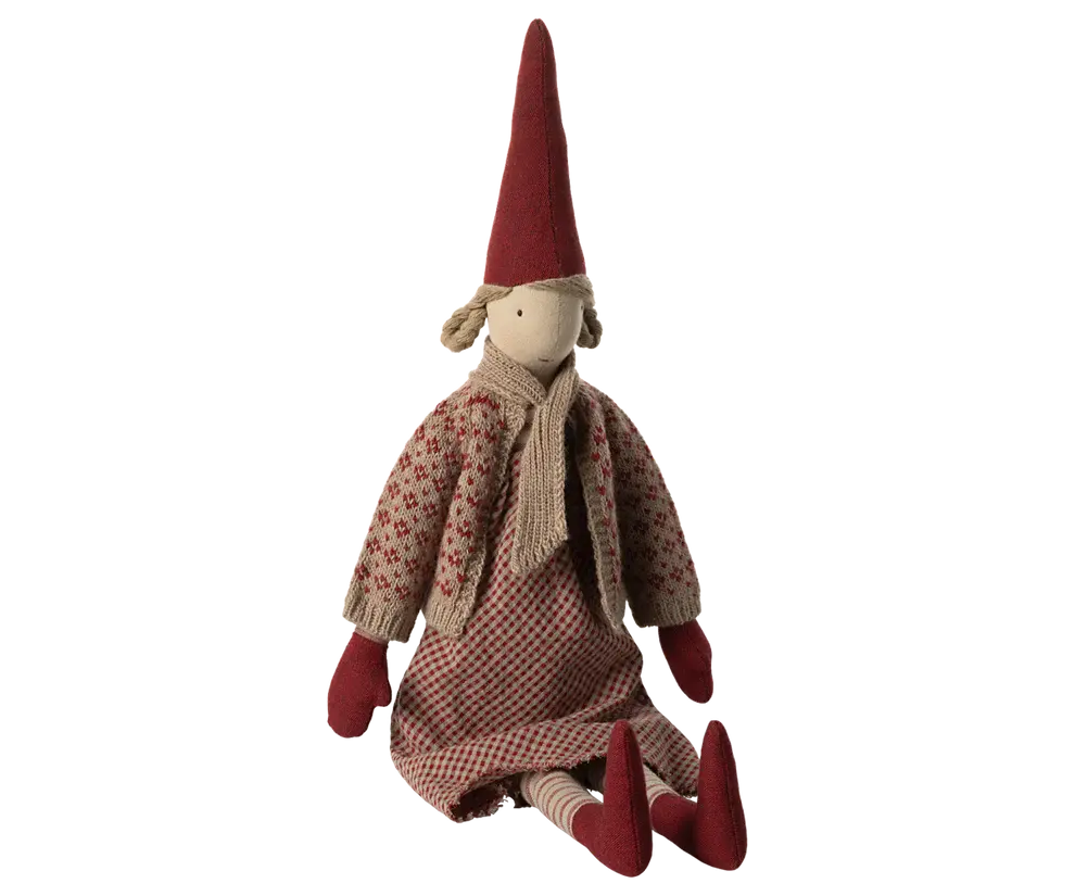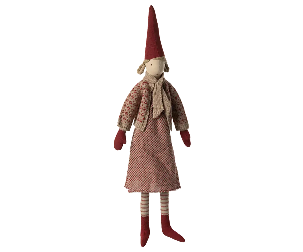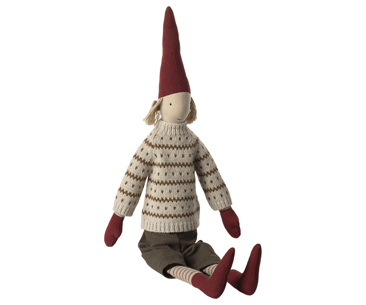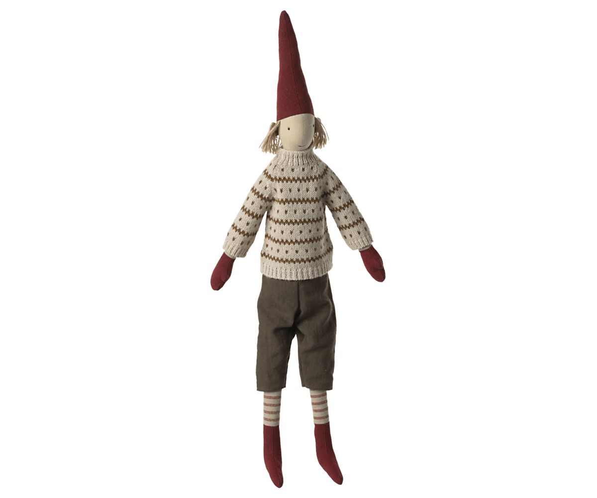 Mailegs Pixy-nisser er elskede julefigurer, der bringer varme, nostalgi og tradition ind i hjemmet. Denne Pixy-nissedreng i størrelse 4 er klædt i en striksweater med smukt sand- og brunmønstret design, der giver ham et klassisk og hyggeligt udtryk. Den varme farvekombination og de fine detaljer skaber en autentisk julestemning med et strejf af nordisk charme. Med sin højde på ca. 60 cm er han en markant og dekorativ figur, perfekt til at placere ved pejsen, i vindueskarmen eller som en del af en stemningsfuld juleopstilling. Figuren er fremstillet i bløde tekstiler med håndlavede detaljer, hvilket gør hver Pixy helt unik. En klassisk julefigur, der kan tages frem år efter år og blive en fast del af familiens juletraditioner.