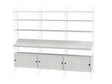 String Living room G er en komplet og elegant opbevaringsløsning til stuen, hvor du får både lethed, struktur og masser af plads. Kombinationen er skabt til dig, der vil have et stilrent udtryk på væggen, men samtidig har brug for opbevaring, der kan rumme hverdagen. Her får du åbne hylder til bøger, kunst og personlige favoritter, skrå magasinhylder der holder styr på magasiner og aviser, samt lukkede skabe med skydelåger til alt det, du gerne vil gemme væk. Resultatet er en rolig væg, der føles gennemtænkt og som løfter hele rummet.