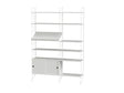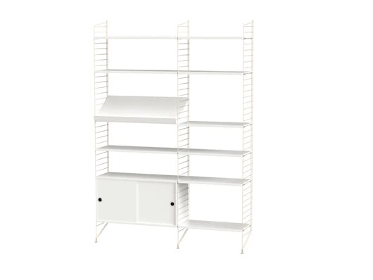 String Living room H er en komplet og balanceret opstilling, der gør det let at skabe en smuk opbevaringsvæg med både udstilling og skjult plads. Kombinationen er ideel til stuen, hvor du vil have orden uden at miste det lette String udtryk. De åbne hylder giver plads til bøger, kunst og personlige fund, den skrå magasinhylde samler aviser og magasiner pænt, og skabet med skydelåger gemmer alt det praktiske væk, så rummet føles roligt og gennemført.