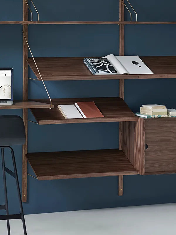 Royal System® reolsystem kan sammensættes individuelt efter behov, fx som moderne skrivepult, som bibliotek eller som almindeligt reolsystem med forskellige skabsmoduler. Reolen fås i materialerne sortbejdset eg, eg, røget eg og valnød med bøjler i messing eller rustfrit stål.