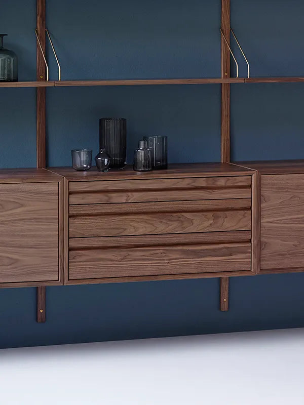 Royal System® reolsystem kan sammensættes individuelt efter behov, fx som moderne skrivepult, som bibliotek eller som almindeligt reolsystem med forskellige skabsmoduler. Modulet fås i materialerne sortbejdset eg, eg og valnød med ophæng.