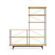 Denne version, 3-3 Right, har et karakteristisk asymmetrisk forløb, hvor de højere sektioner til højre skaber en let og skulpturel balance. De lakerede egetræshylder tilfører varme og naturlig struktur, mens stel og sokkel i sort pulverlakeret stål giver en markant kontrast og grafisk ro.
