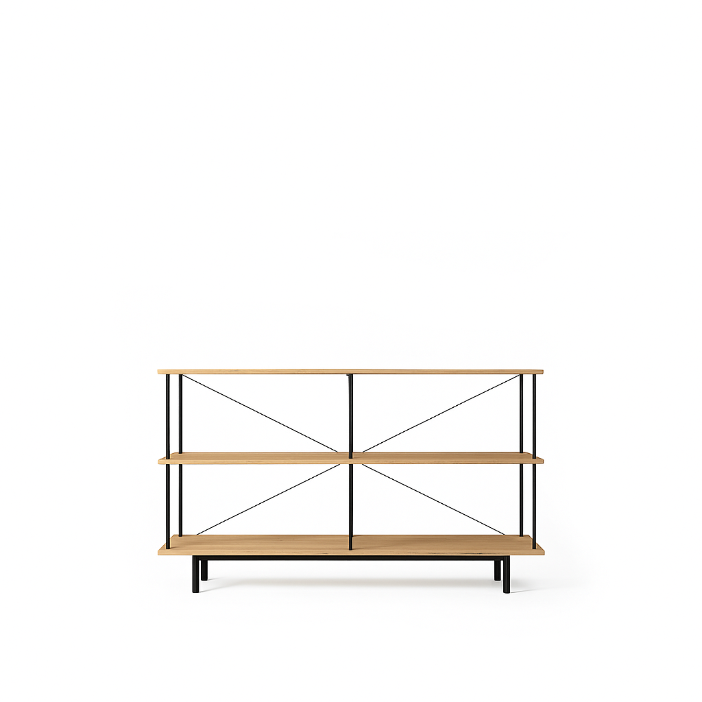 Denne model, Seiton 3, er lav og horisontal med tre velafbalancerede niveauer, der giver et let og roligt udtryk. De lakerede egetræshylder tilfører varme og naturlig struktur, mens stel og sokkel i sort pulverlakeret stål giver en grafisk kontrast og solid stabilitet.