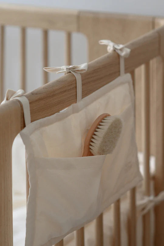 Denne smukke sengelomme i økologisk bomuld er både hyggelig og praktisk til opbevaring af babys sutter, nusseklud og andre småting. Sengelommen er designet i Danmark og lavet af det blødeste økologiske bomuld.