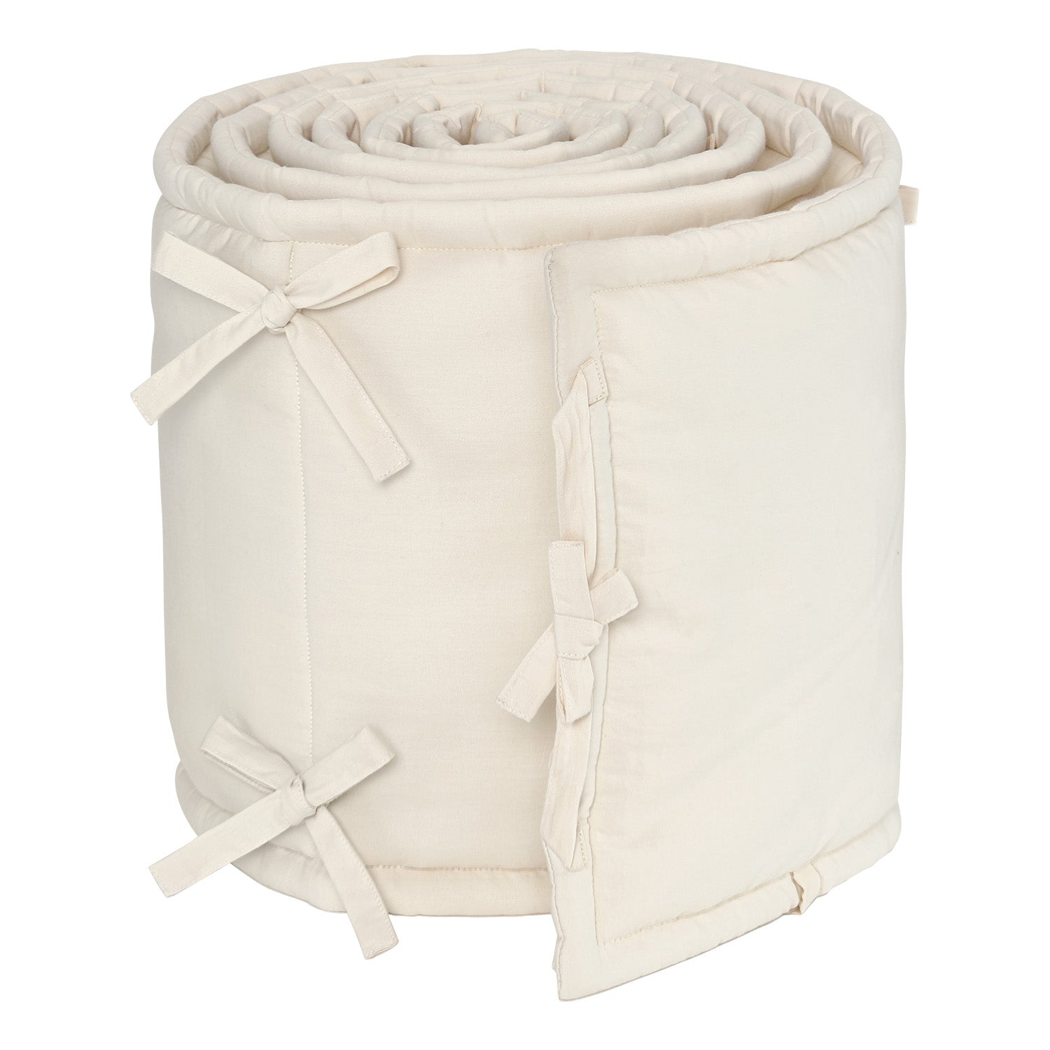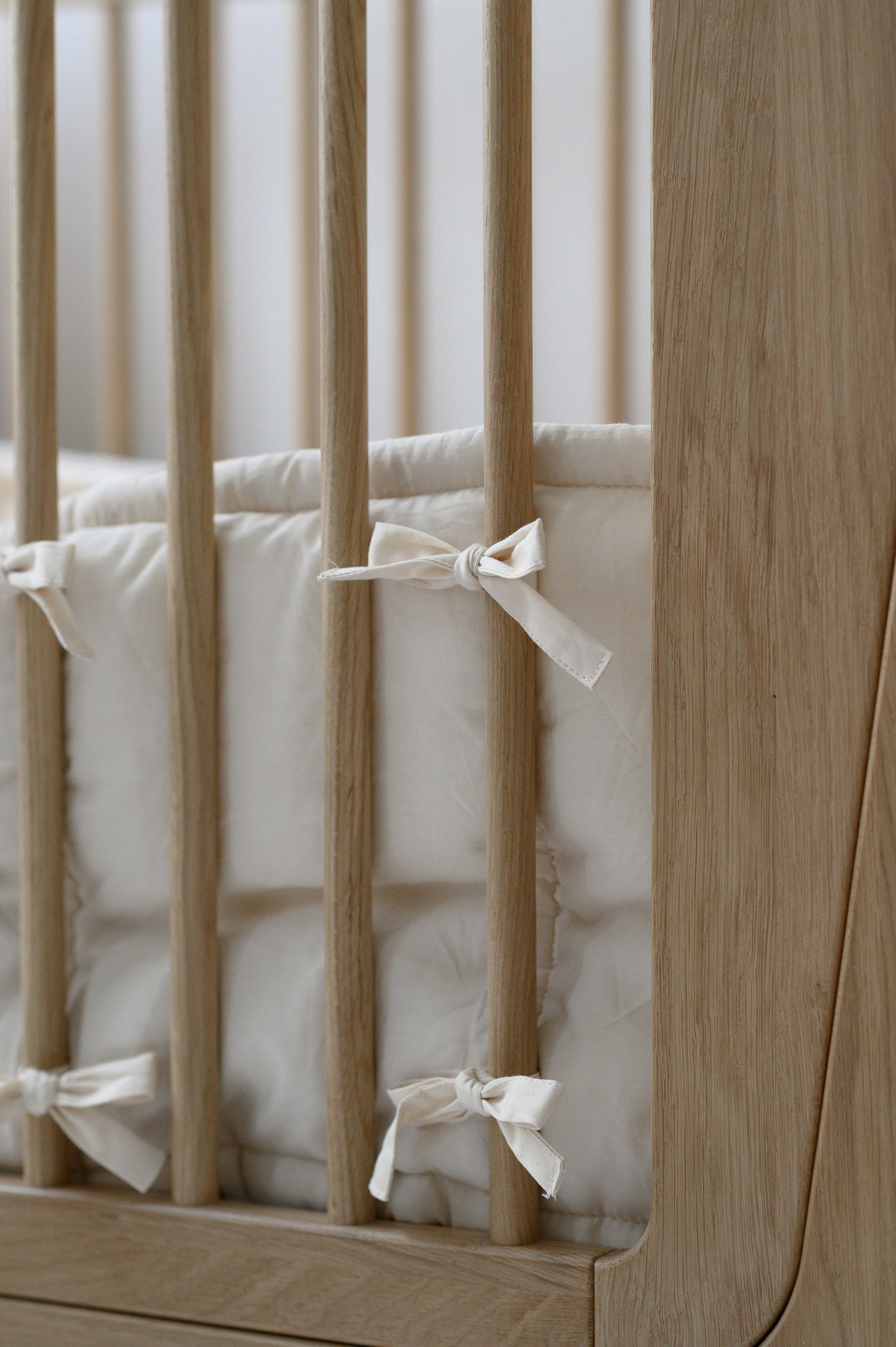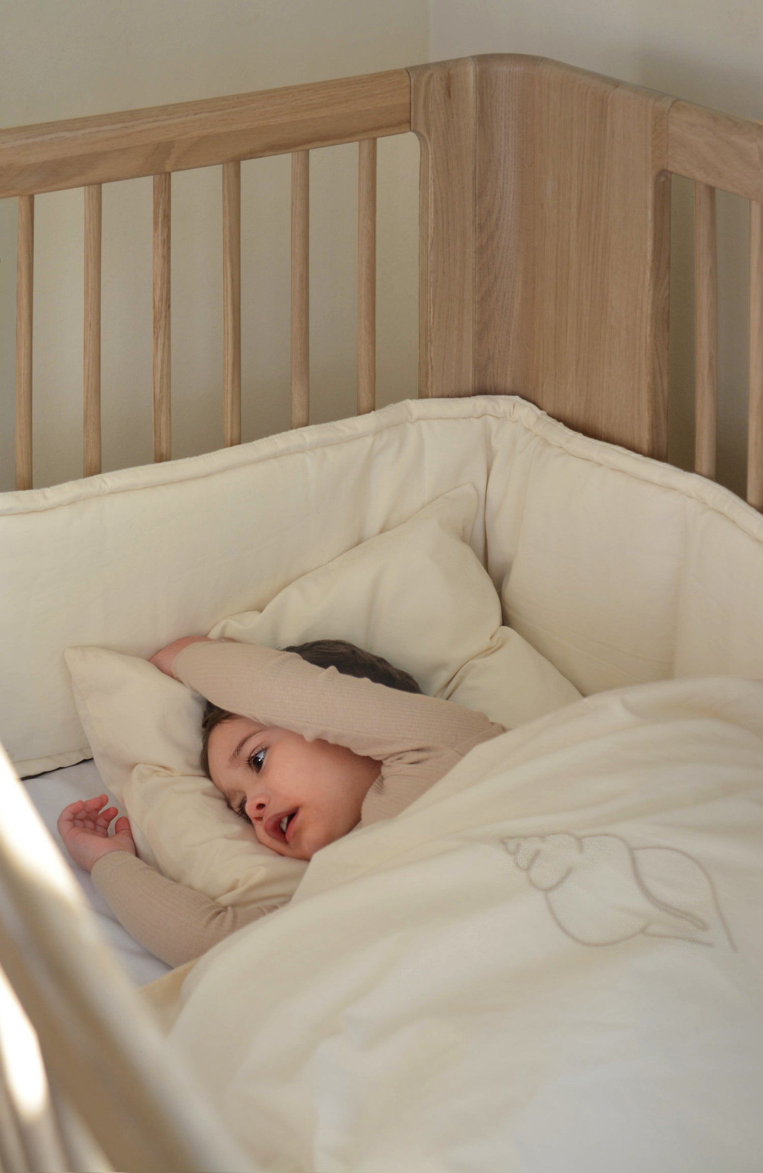 Vores sengerand i økologisk bomuld er skabt specielt til at passe perfekt til Nature Tremmesengen fra We Are Bitte. Den fungerer både som en smuk og harmonisk del af sengens udtryk og som en praktisk løsning, der beskytter baby mod sengens kanter. Samtidig er sengeranden med til at skabe et trygt, blødt og hyggeligt sovemiljø, hvor dit barn kan sove roligt.