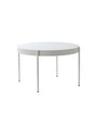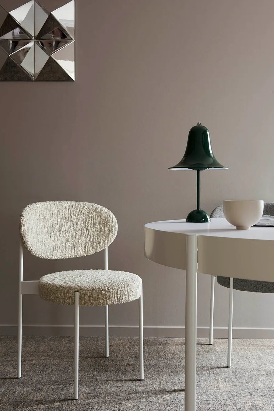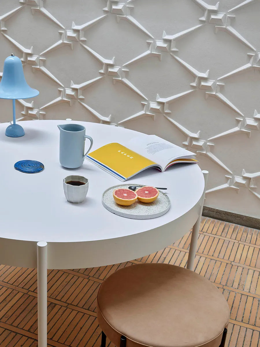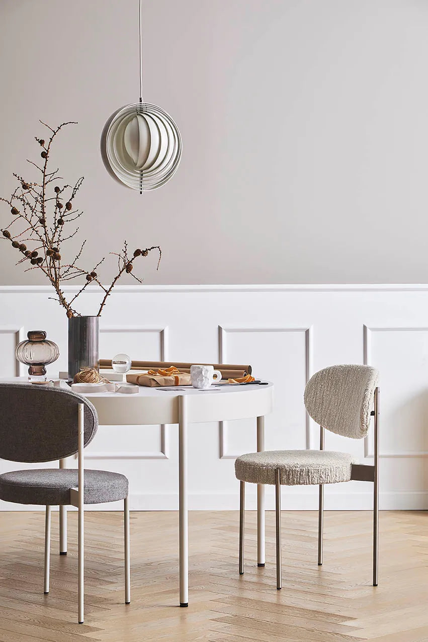 Det runde Serie 430 spisebord fra Verpan er designet af Verner Panton i 1967. Bordet laves i sort eller hvidt i to størrelser på Ø120 eller Ø160 cm. Bordpladen er lavet i malet MDF med Fenix (Nanotech) laminat øverst.