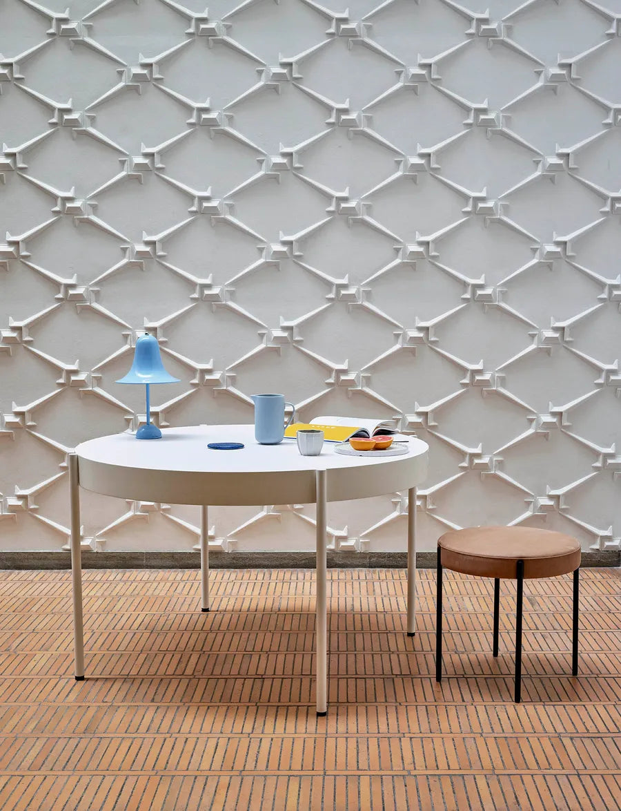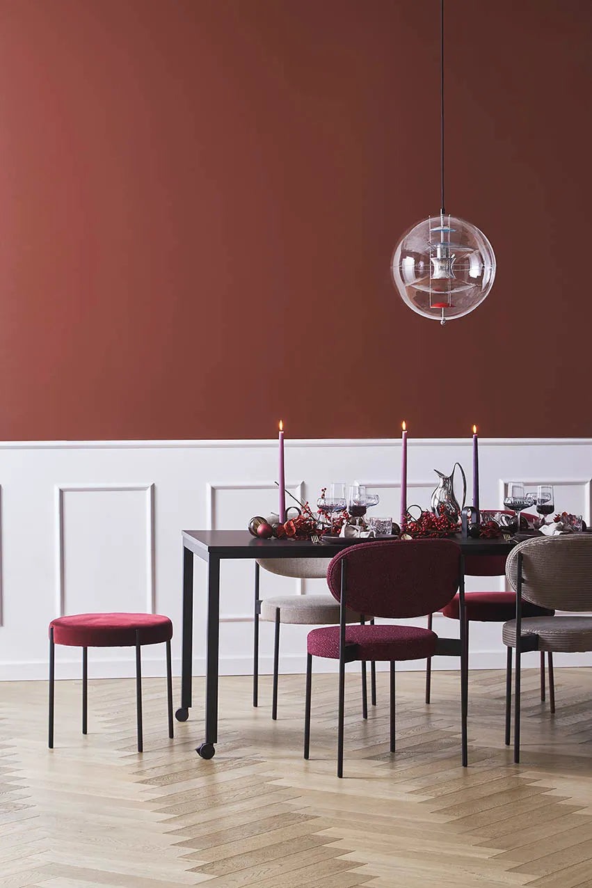 Serie 430 skamlen fra Verpan med sort stel. Skamlen er designet af Verner Panton i 1967 og kan vælges med stof eller læder på sædet.