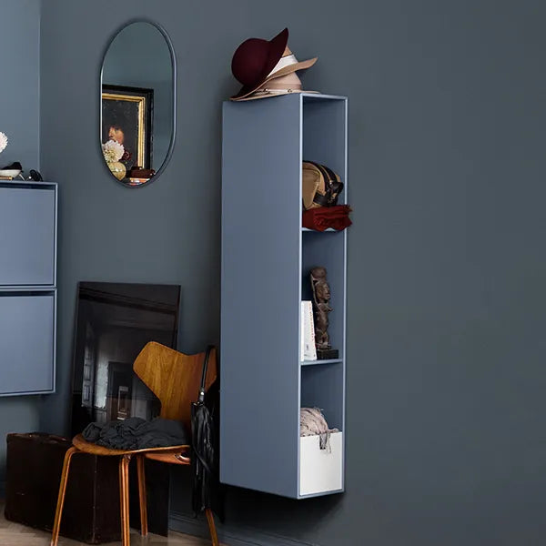 Sidehængt reol fra Montana med mulighed for at tilføje et spejl på forsiden, eller en smart kanvas boks til opbevaring. Følgende modeller: VI25R: Højre, 2 hylder VI25L: Venstre, 2 hylder VI24R: Højre, 5 hylder VI24L: Venstre, 5 hylder Serie: Montana Hall Edition Model: Side-hanged module (VI25R/VI25L, VI24R/VI24L) Farver: 40 farver (Montanas standardfarver) Quickship farver: Anthracite, New white & Nordic Designet af: Peter J. Lassen Mål: H: 138 cm B: 24 cm D: 38 cm
