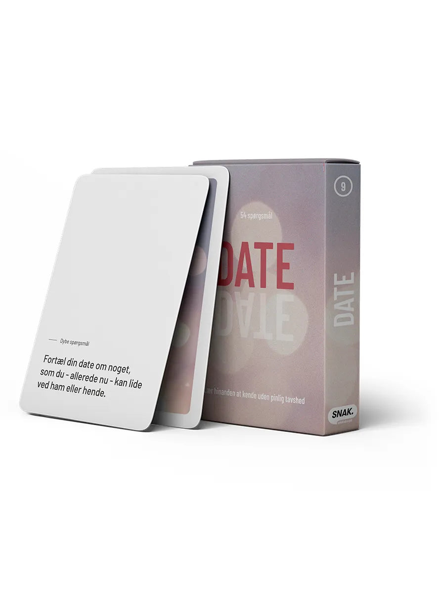 SNAK er en stor samling af forskellige samtalekort. Hjælp samtalen i gang med de mange forskellige kort, og undgå pinlig tavshed på din date. "Hvornår sang du sidst for dig selv?" eller "Hvad sætter du pris på i et forhold?" er blot nogle af de spørgsmål, du kan støde på i dette sæt af samtalekort til daten.