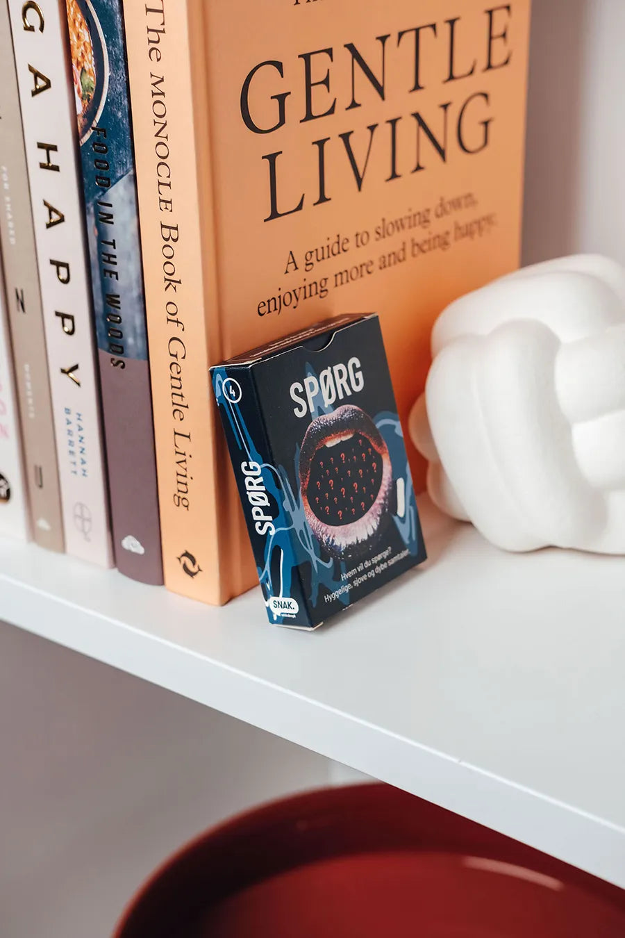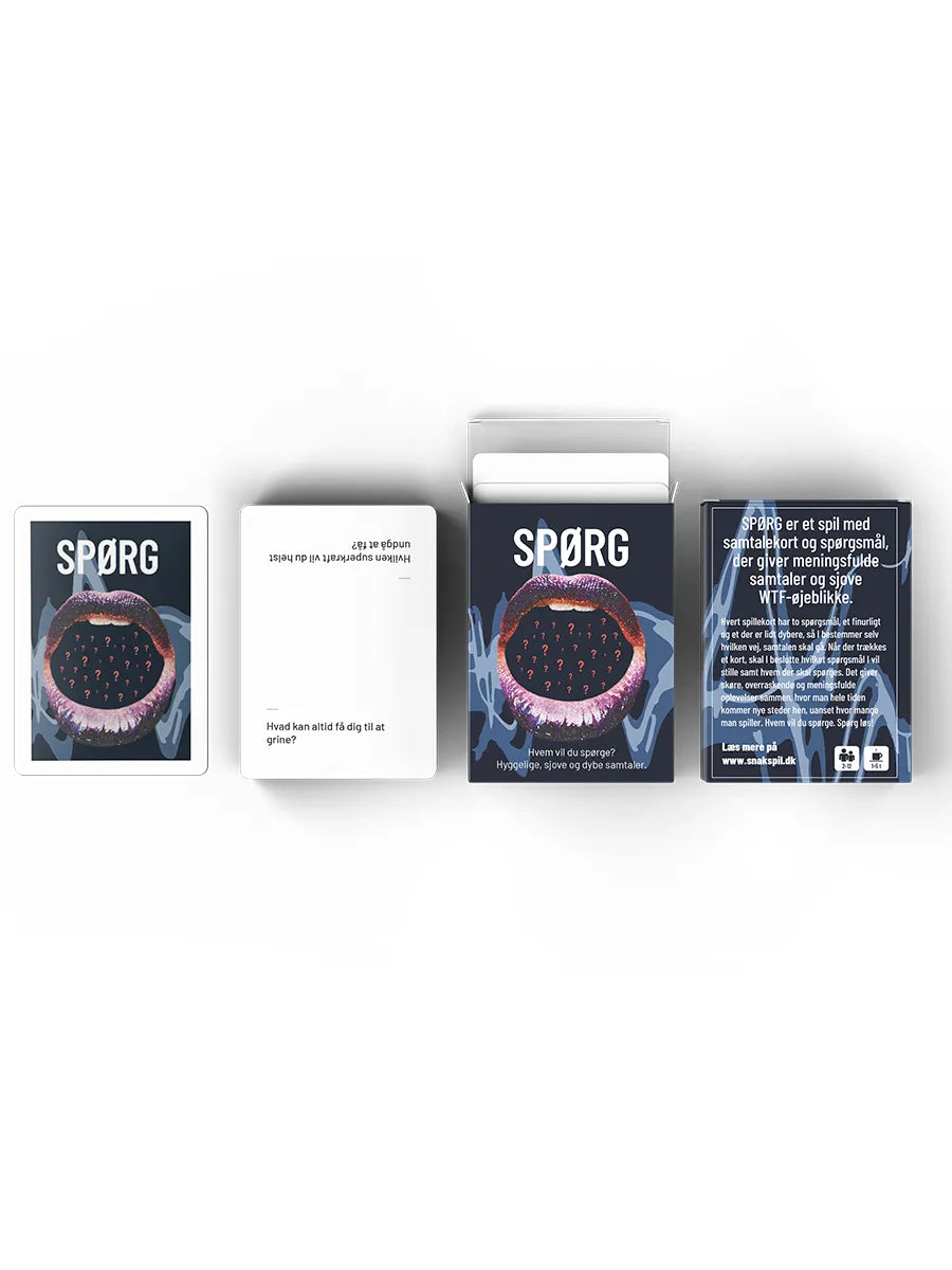 SNAK er en samling af forskellige samtalekort. Hjælp samtalen i gang med de mange forskellige kort, og bliv klogere på menneskerne omkring dig. Kortsættet Spørg byder på både sjove, hyggelige og dybe spørgsmål. Hvert enkelt kort indeholder to hyggelige spørgsmål og et dybere, så I selv kan vælge, hvilken retning, I vil trække samtalen i.