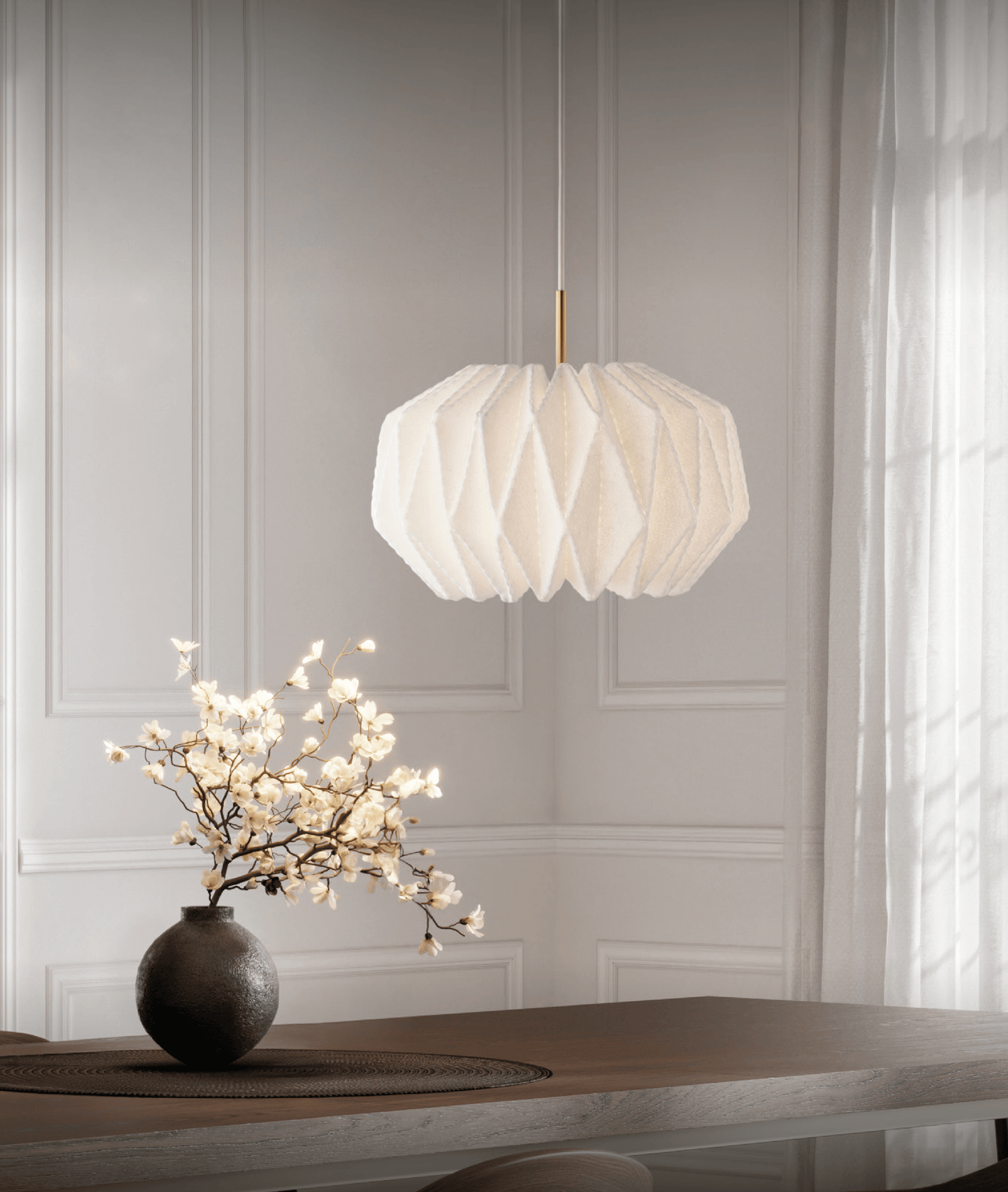 Pendant, Softly Pleated I, round M, brass fit fra Le Klint emmer af taktil ro og raffineret dansk design. Den håndfoldede filt giver en blød, organisk karakter, mens de fine perforeringer lader et varmt lys sive ud og skaber en hyggelig stemning omkring bordet. Messingophænget tilfører et elegant, eksklusivt udtryk, og den generøse medium størrelse gør pendlen til et naturligt samlingspunkt i stuen, over spisebordet eller i loungen. Softly Pleated forener traditionelt håndværk fra Odense med moderne materialer og funktionalitet, så du får både atmosfære og effektiv nedadrettet belysning i én ikonisk form.