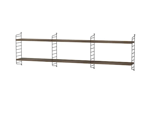 Bundle E består af slanke vægpaneler og flere hylder i en kompakt dybde, der passer ideelt til sengekanten. Her kan du stille bøger, briller, mobil og oplader, en lille plante eller et duftlys, og stadig bevare den minimalistiske String æstetik. Den sorte ramme giver et grafisk og moderne look, mens de sortbejdsede askhylder tilfører varme og dybde, så løsningen føles mere møbel end bare opbevaring. Brug den over sengen for et let svævende udtryk, eller placér den som en lav reol, hvor den kan fungere som dekorativ opbevaring til kurve og kasser.