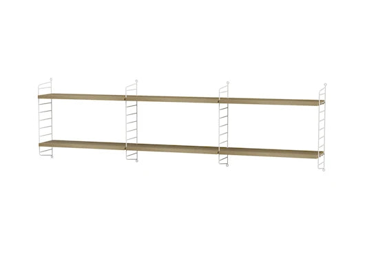 String System Soveværelse Bundle E er den elegante lille genistreg, der kan ændre hele følelsen omkring din seng. Kombinationen er skabt som en luftig opbevaringsløsning i tre sektioner, som enten kan stå for sig selv eller hænge på væggen som et kreativt natbord over sengen. Det giver mere gulvplads, et roligere udtryk og en praktisk hyldeplads præcis dér, hvor du har mest brug for den. Perfekt til dig, der vil indrette soveværelset let og gennemført, uden store møbler der stjæler pladsen.